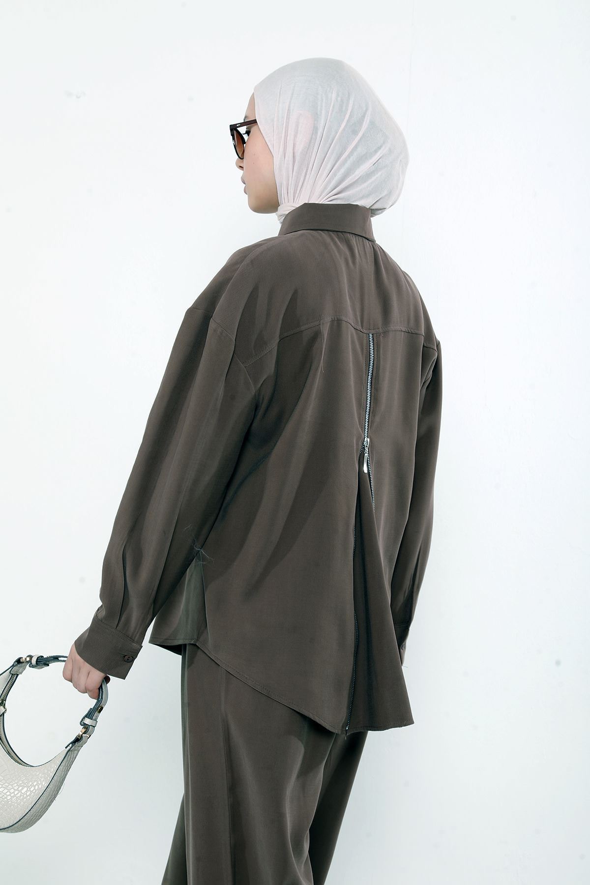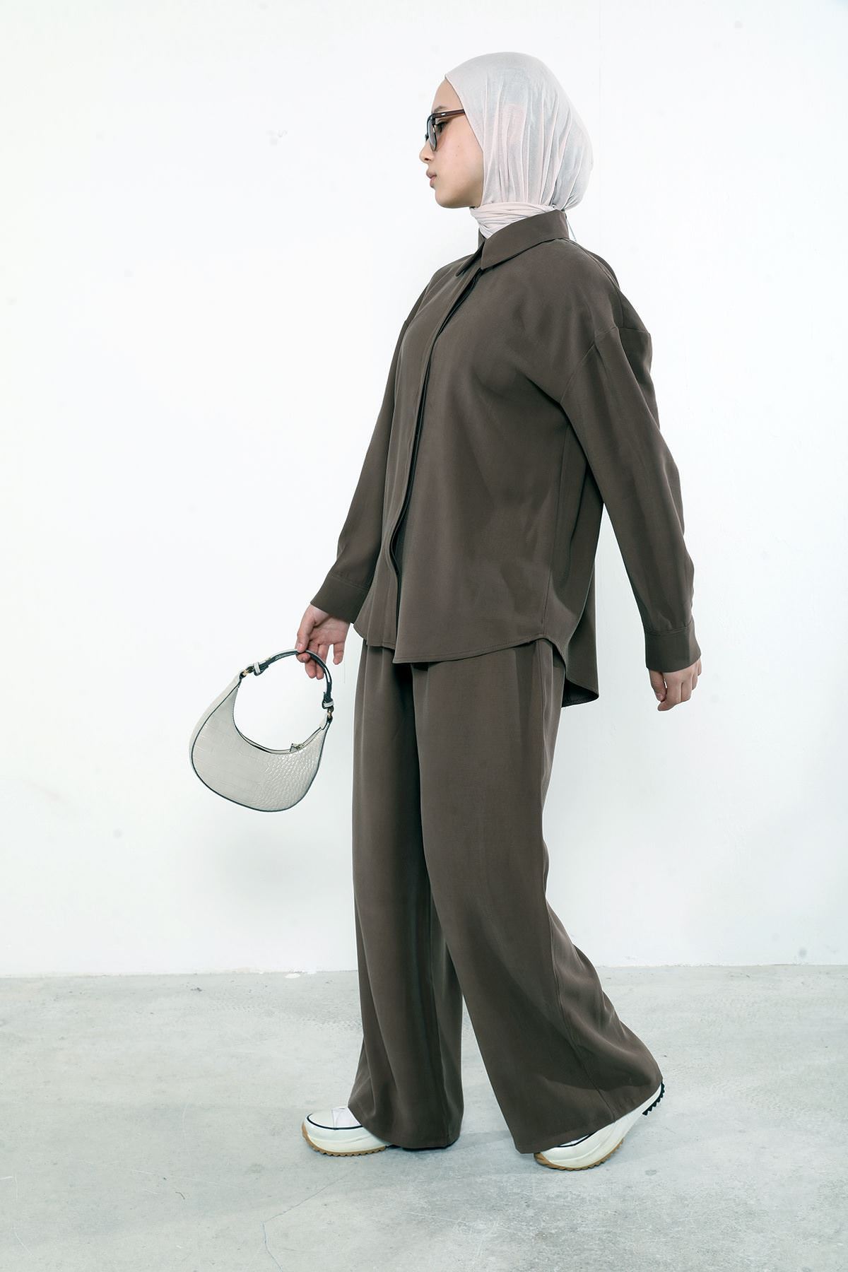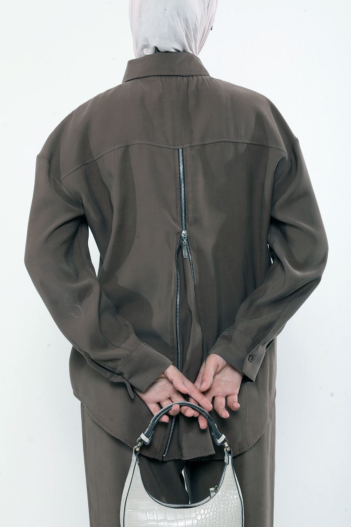 Arka Fermuar Detay Pantolonlu Takım-Kahve
