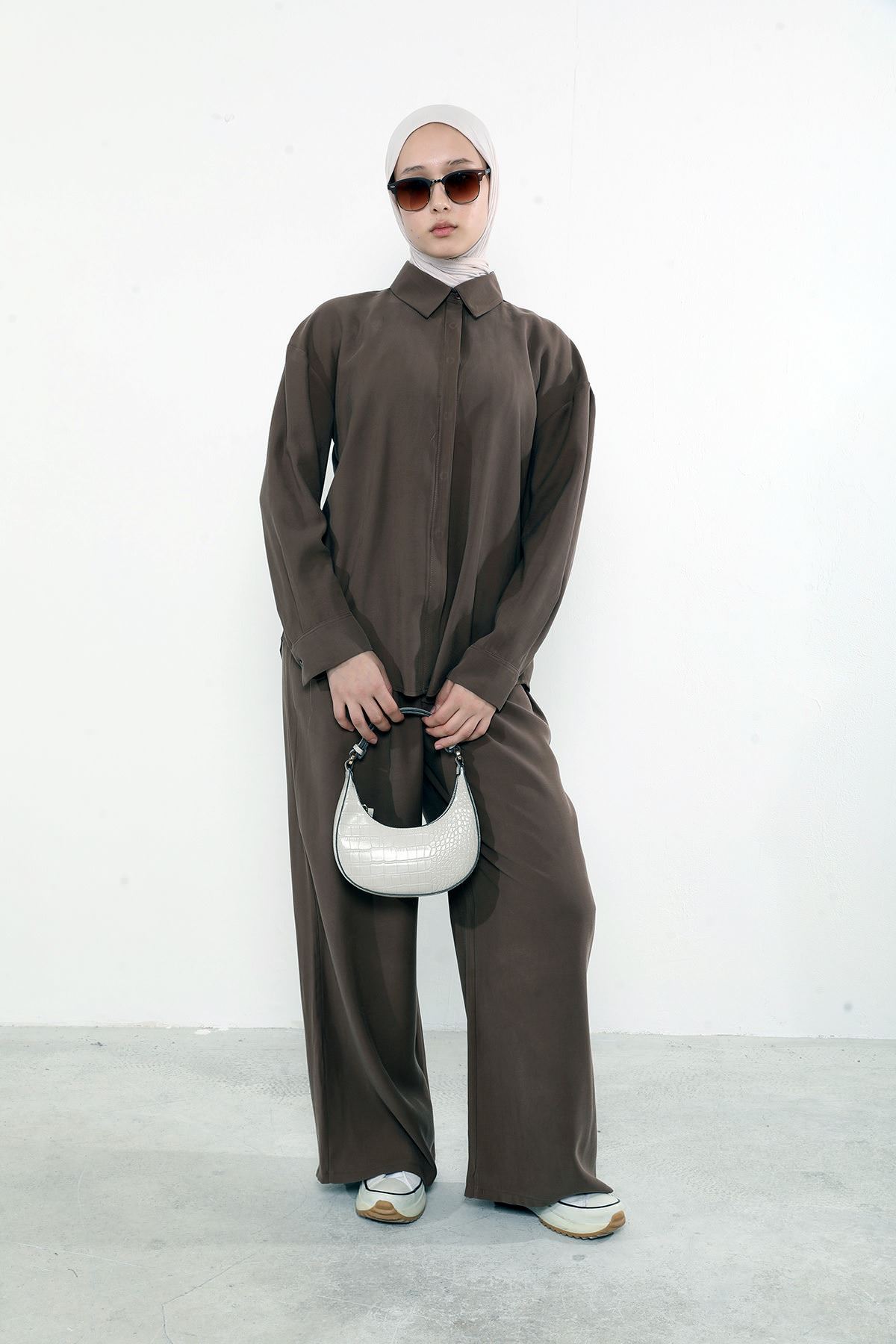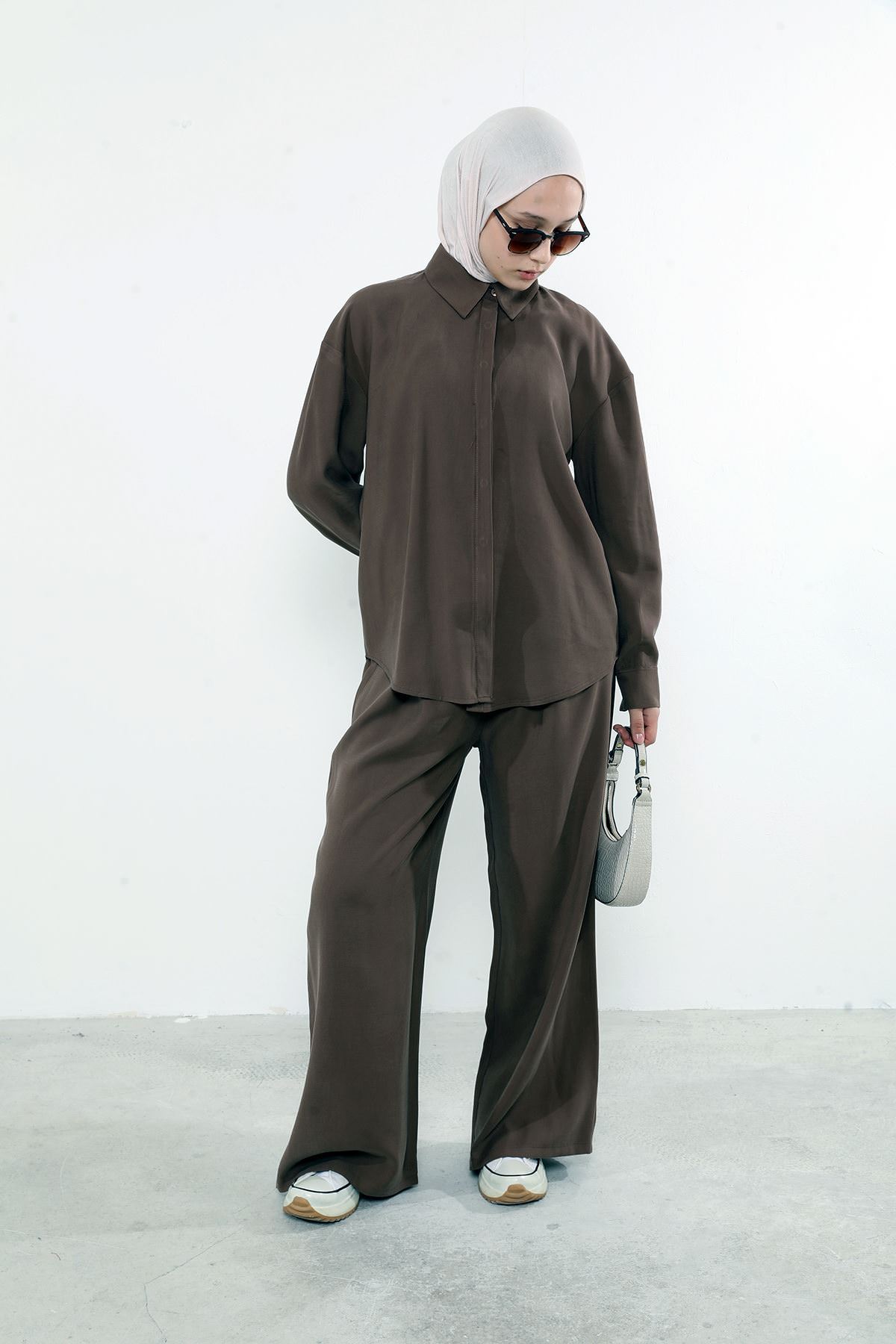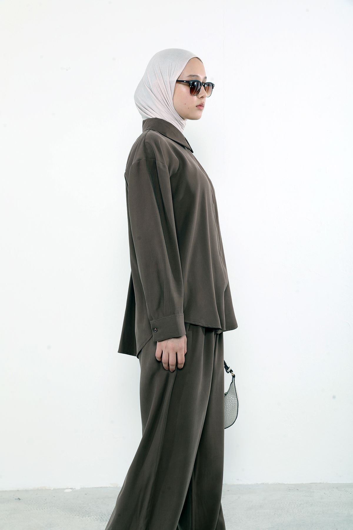 Arka Fermuar Detay Pantolonlu Takım-Kahve