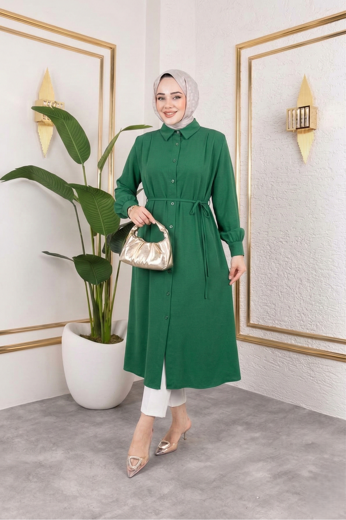 Arka Roba Omuz Pile Uzun Tunik-Zümrüt Yeşili