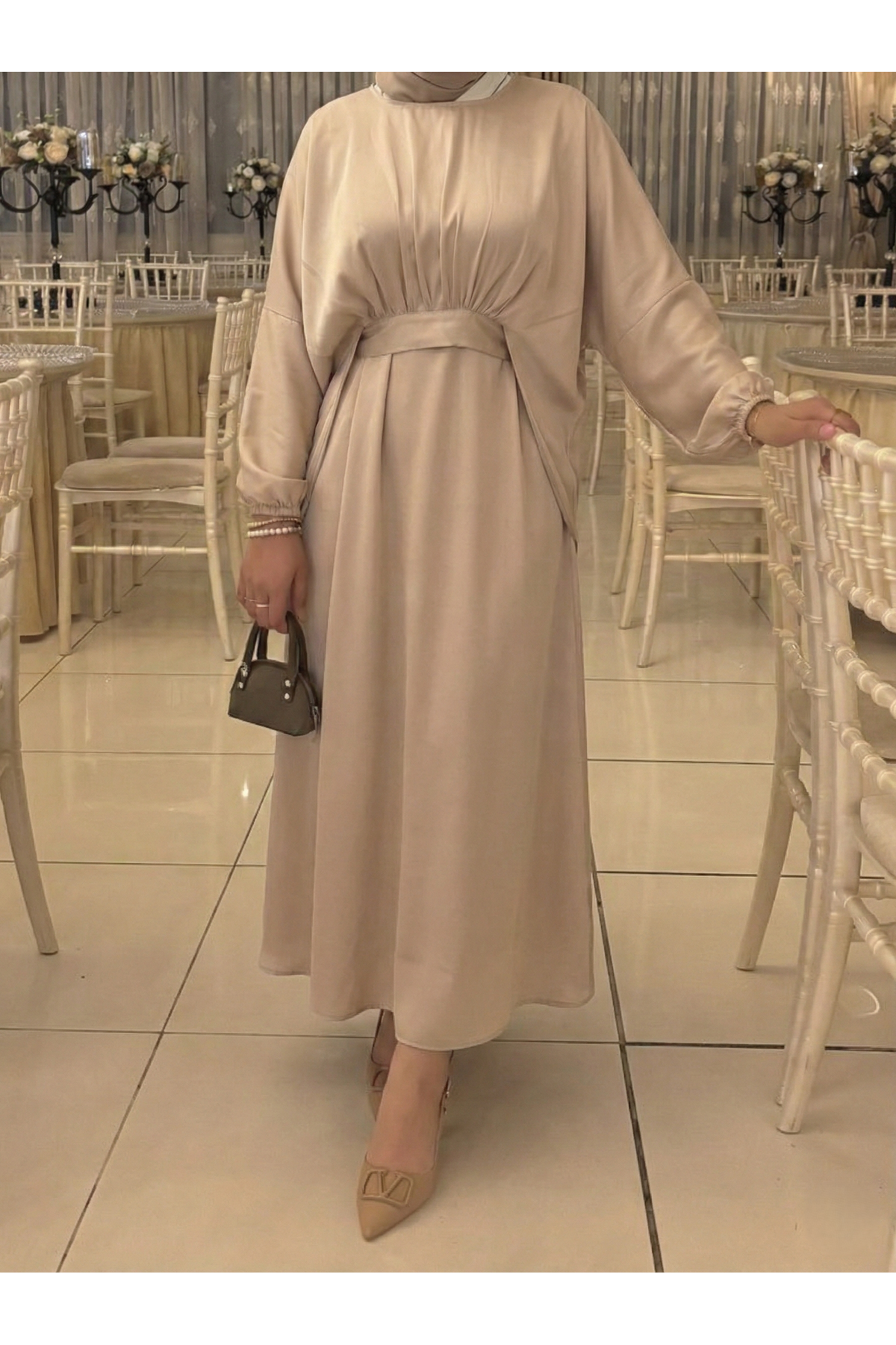 Bağlama Detaylı İkili Saten Elbise-Taş