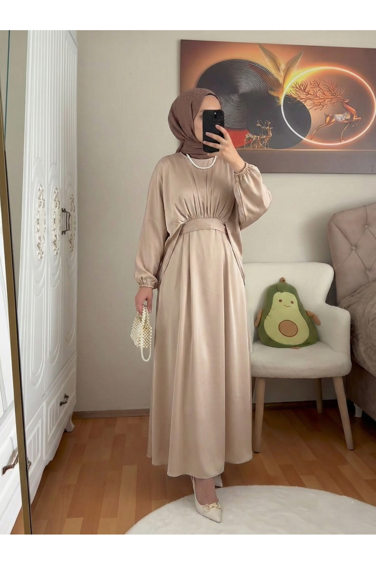 Bağlama Detaylı İkili Saten Elbise