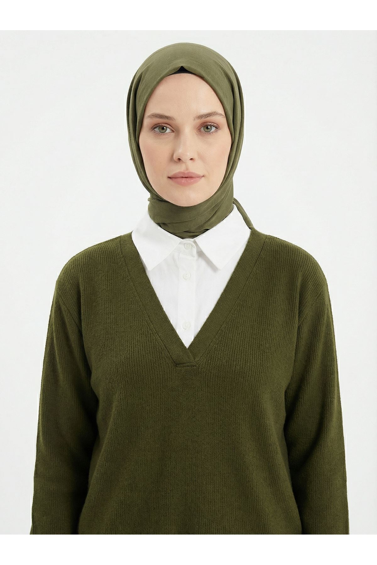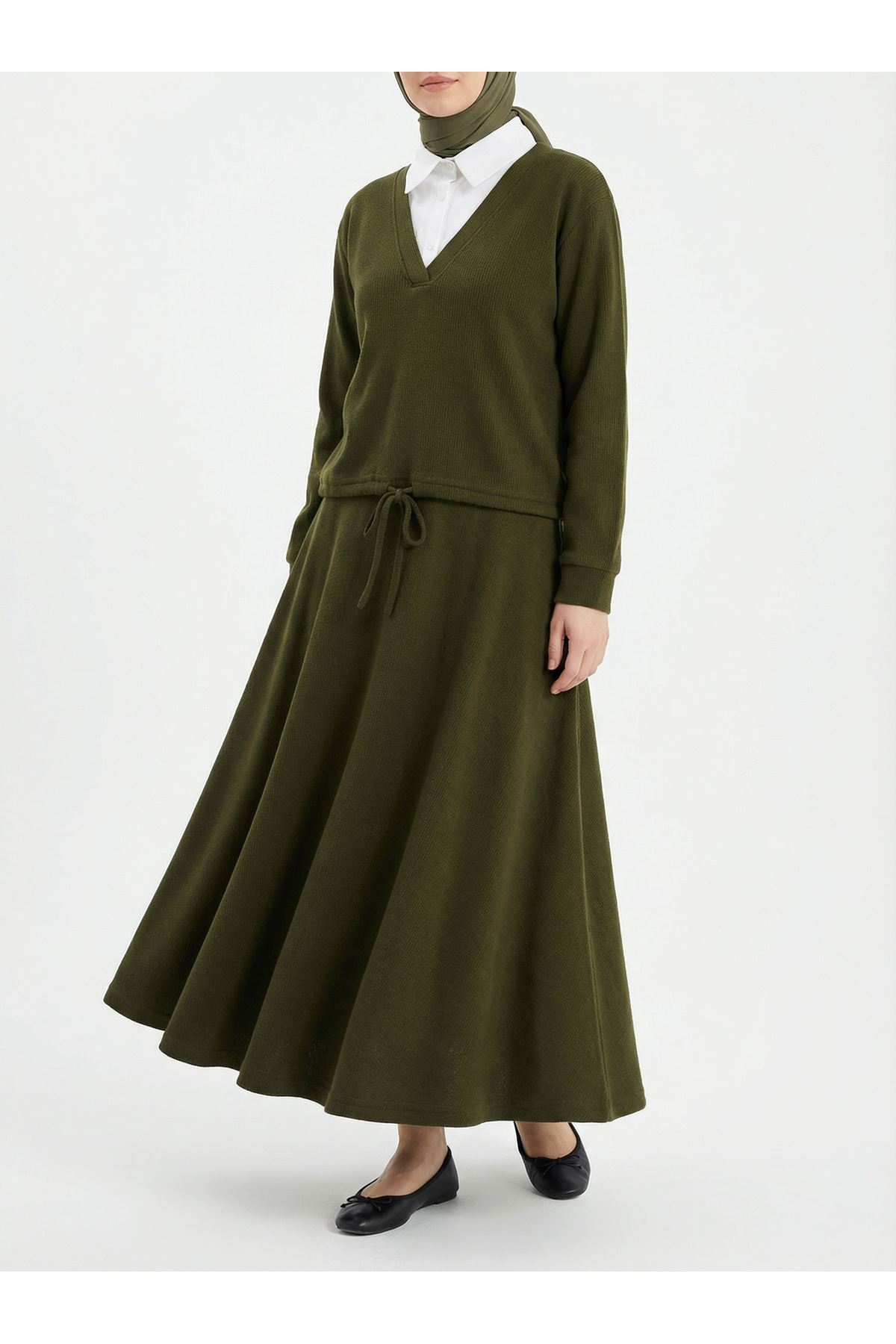 Beyaz Yaka Detaylı Örme Triko Takım-Haki