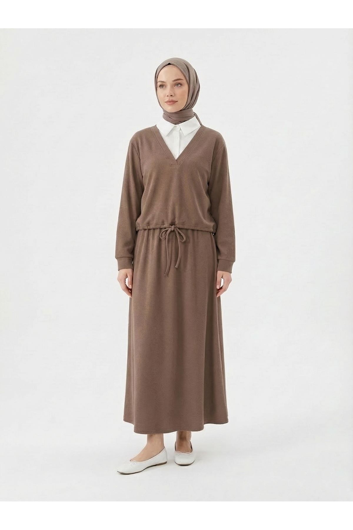 Beyaz Yaka Detaylı Örme Triko Takım-Vizon