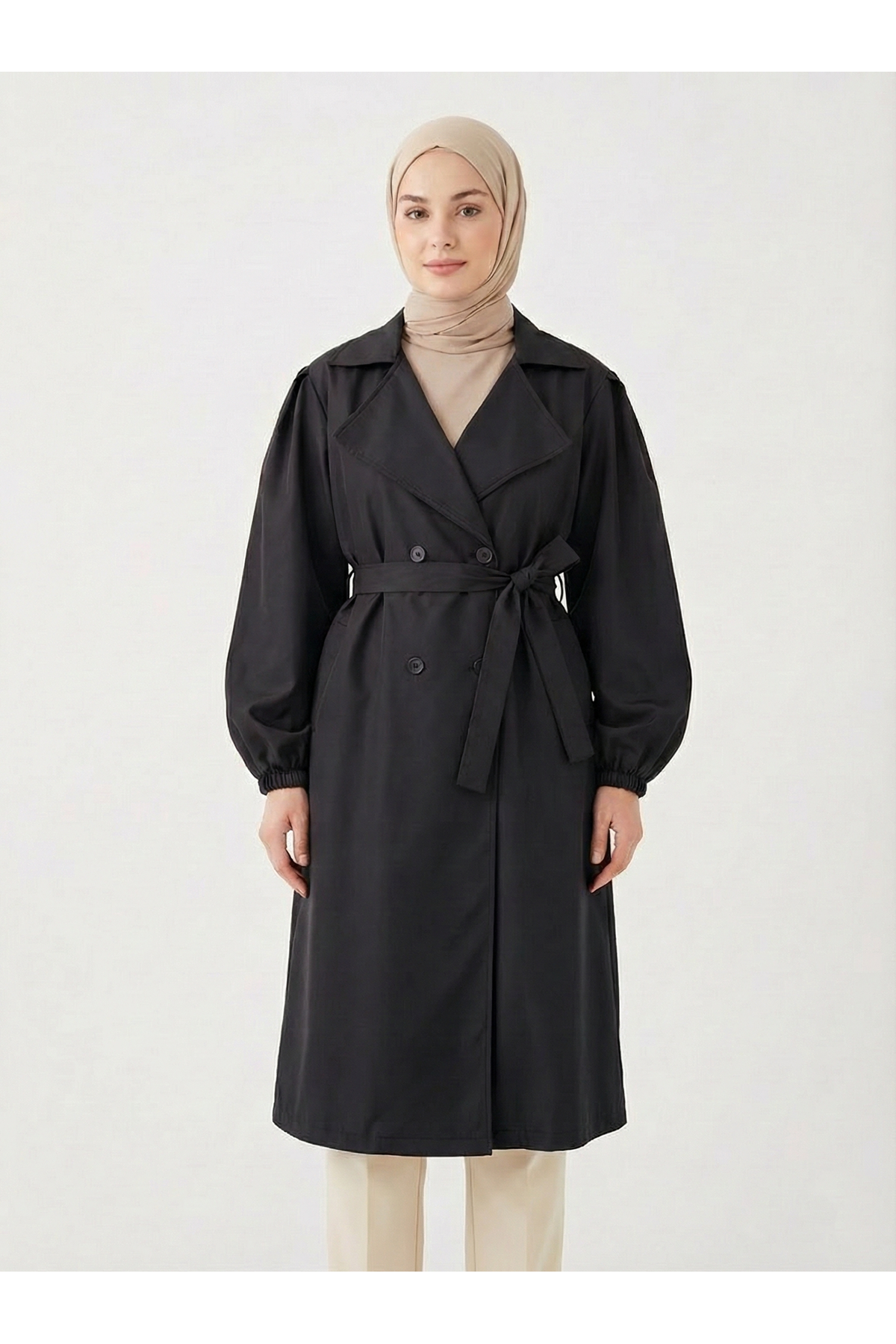 Düğmeli Kruveze Uzun Trenç-Siyah
