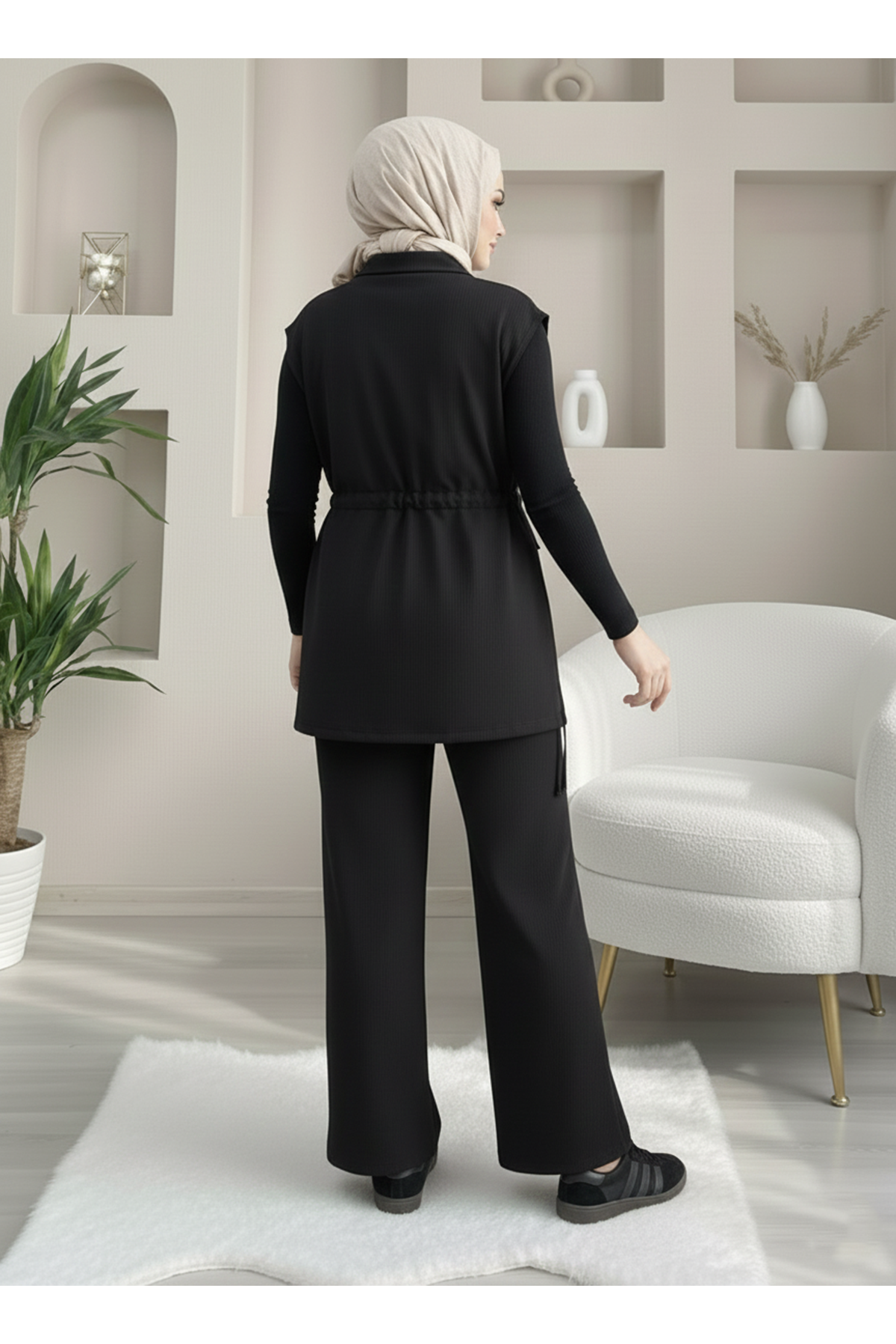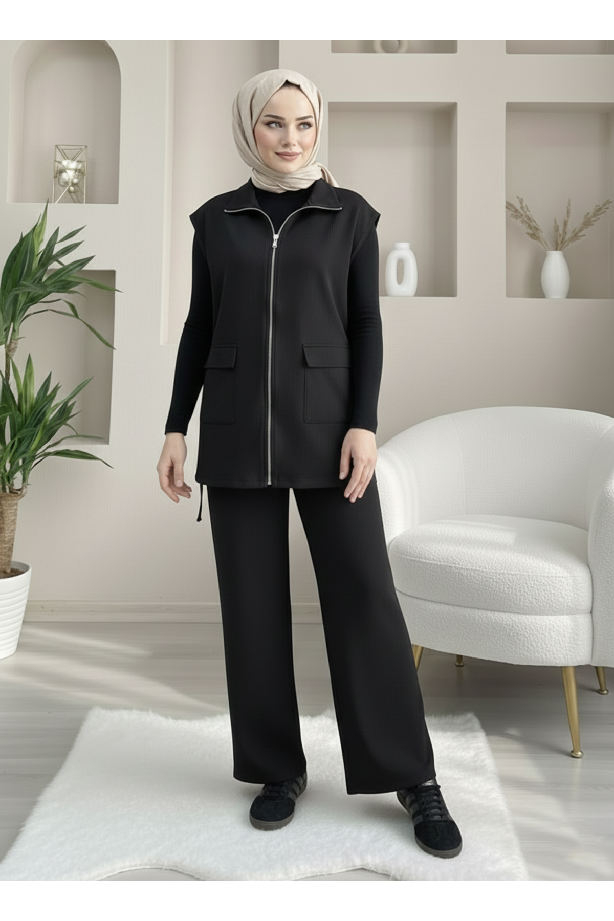 Fermuarlı Cep Detay Yelekli Takım-Siyah