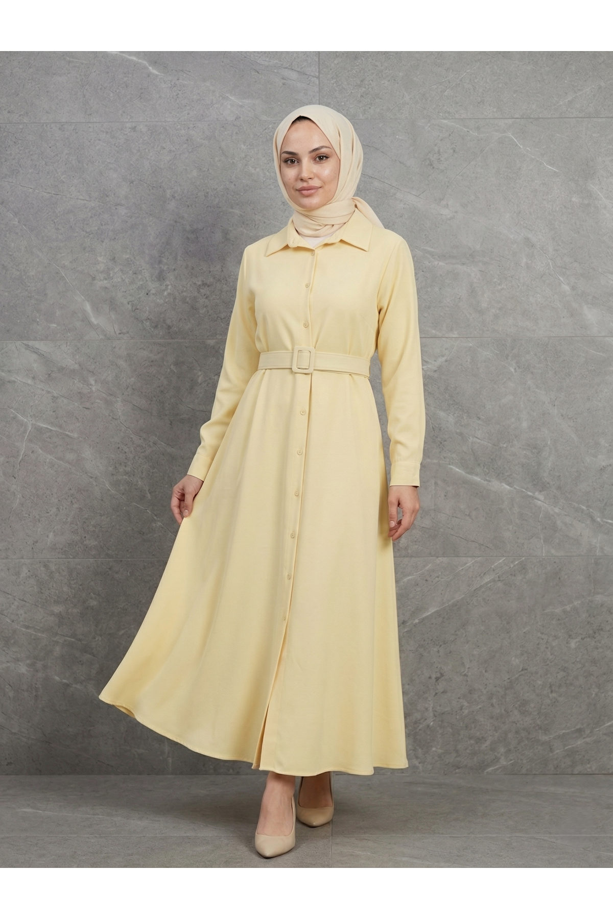 Kaplama Kemer Detay Elbise-Sarı