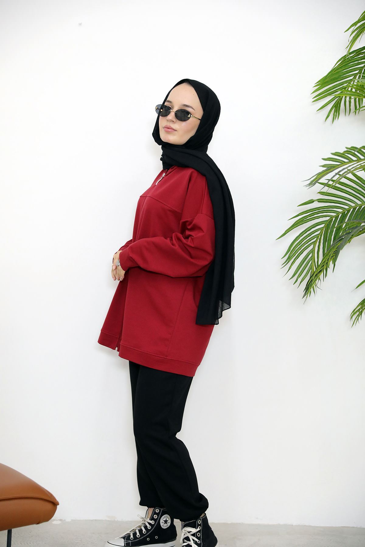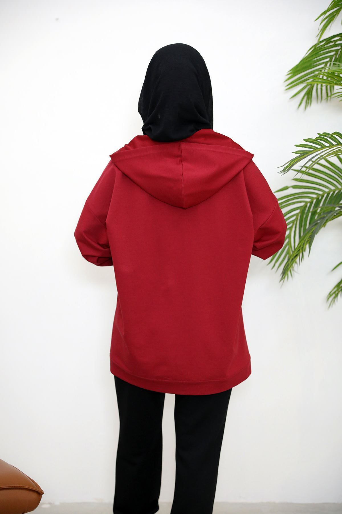 Kapşonlu Fermuar Detay Hırka-Kırmızı