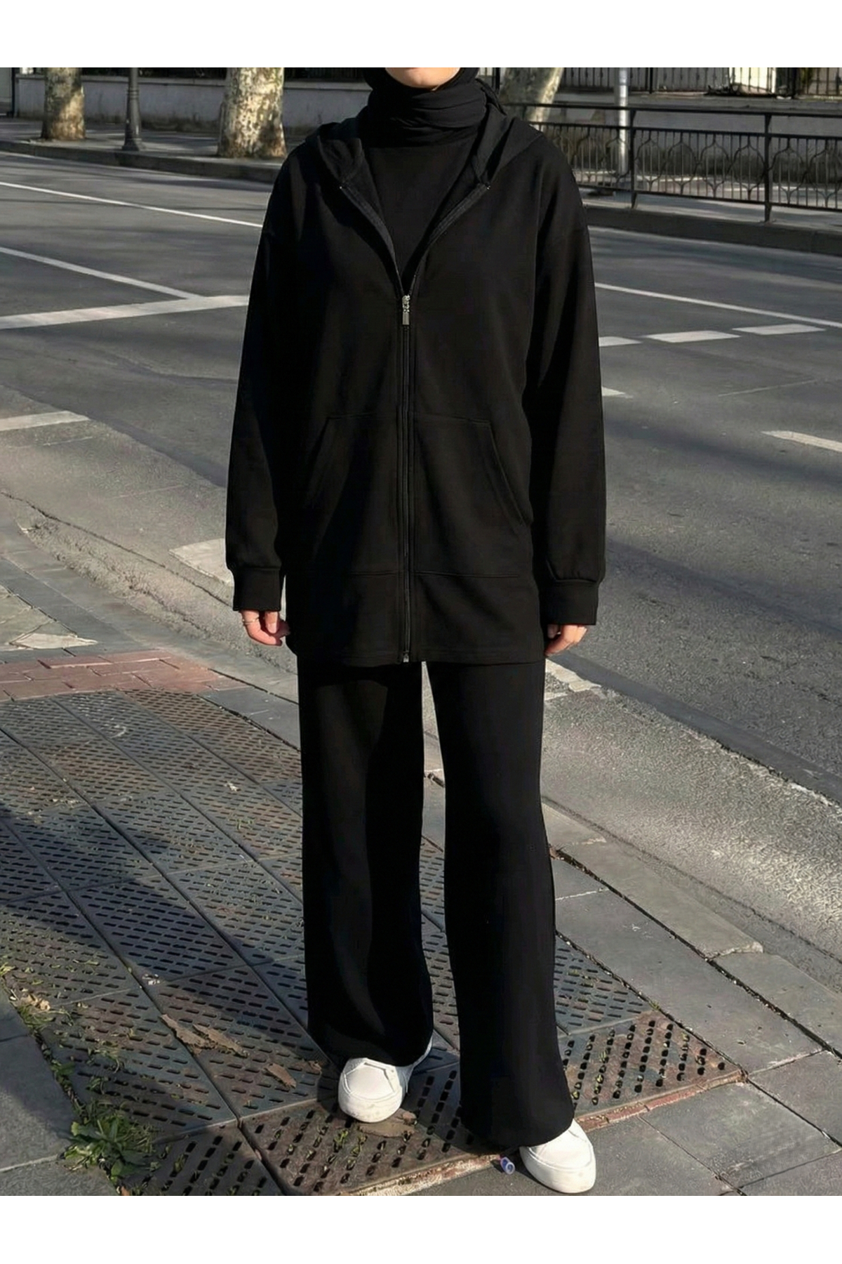 Kapşonlu Fermuar Detay Hırka-Siyah