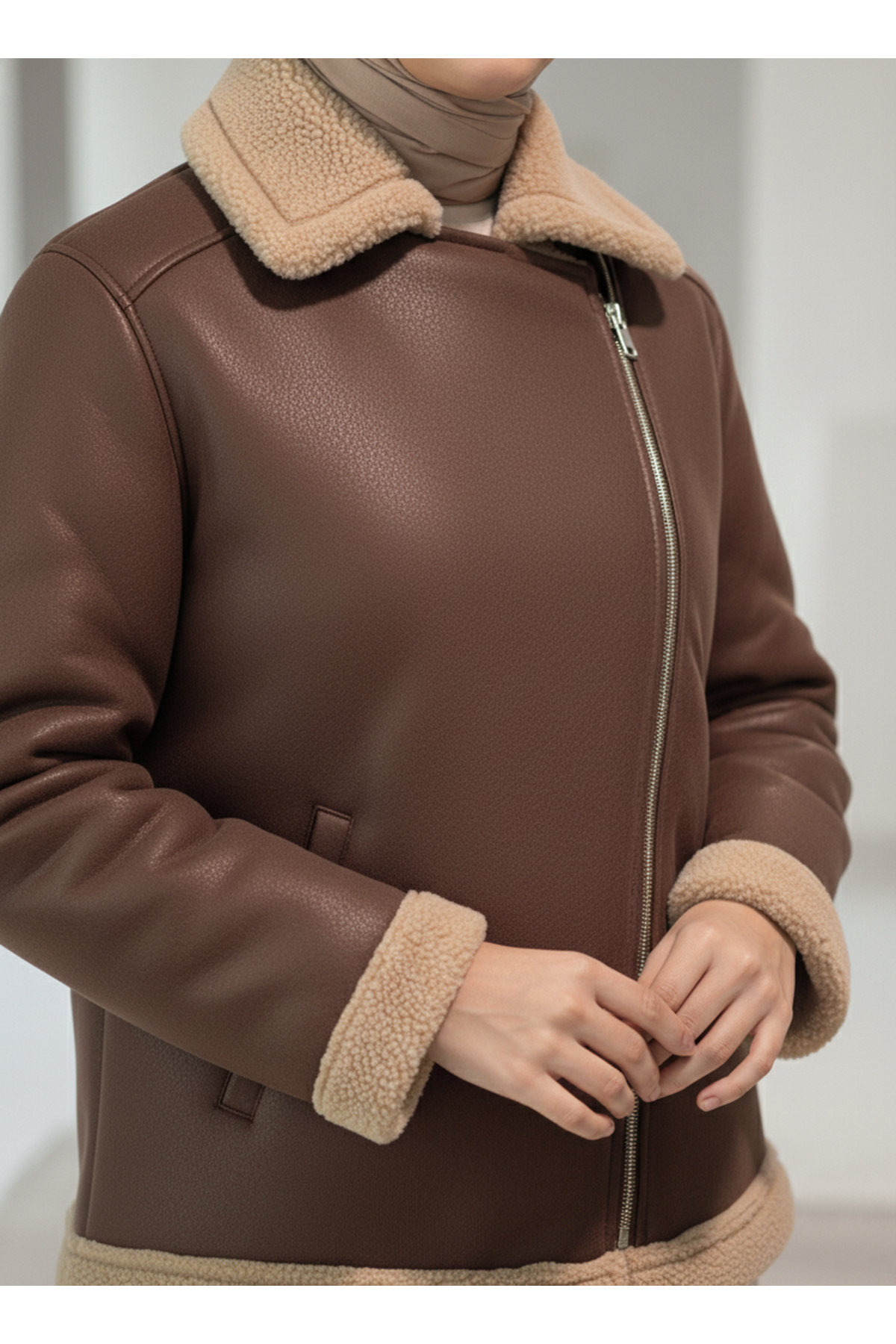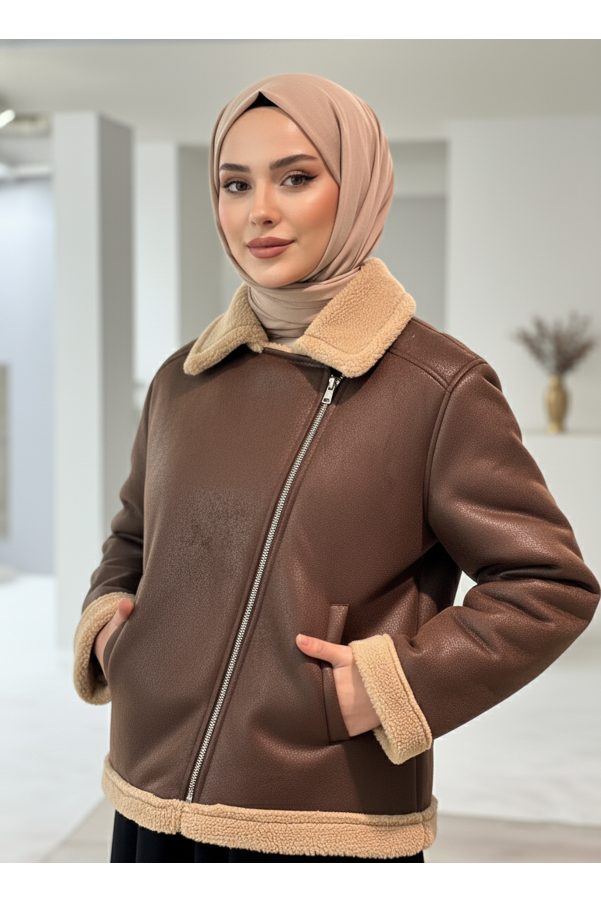 Kruvaze Metal Fermuarlı Ceket-Kahve