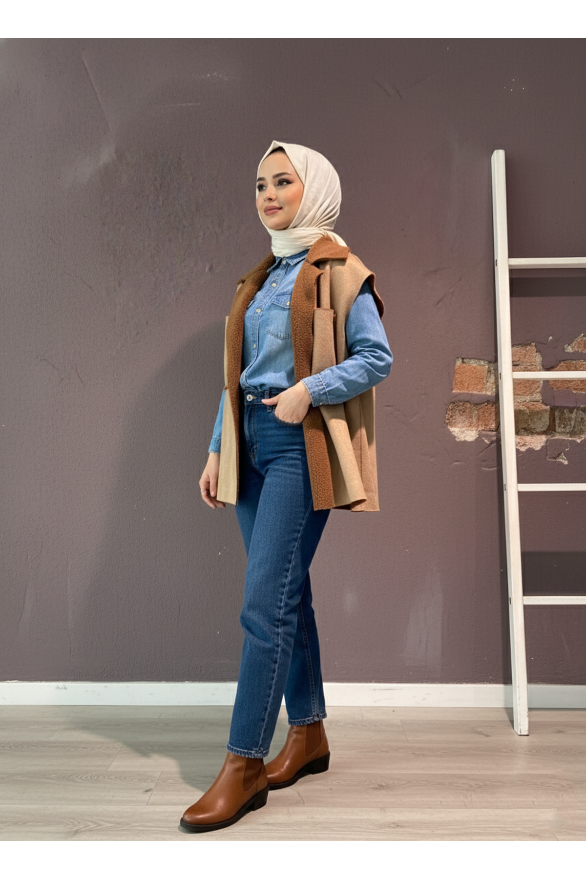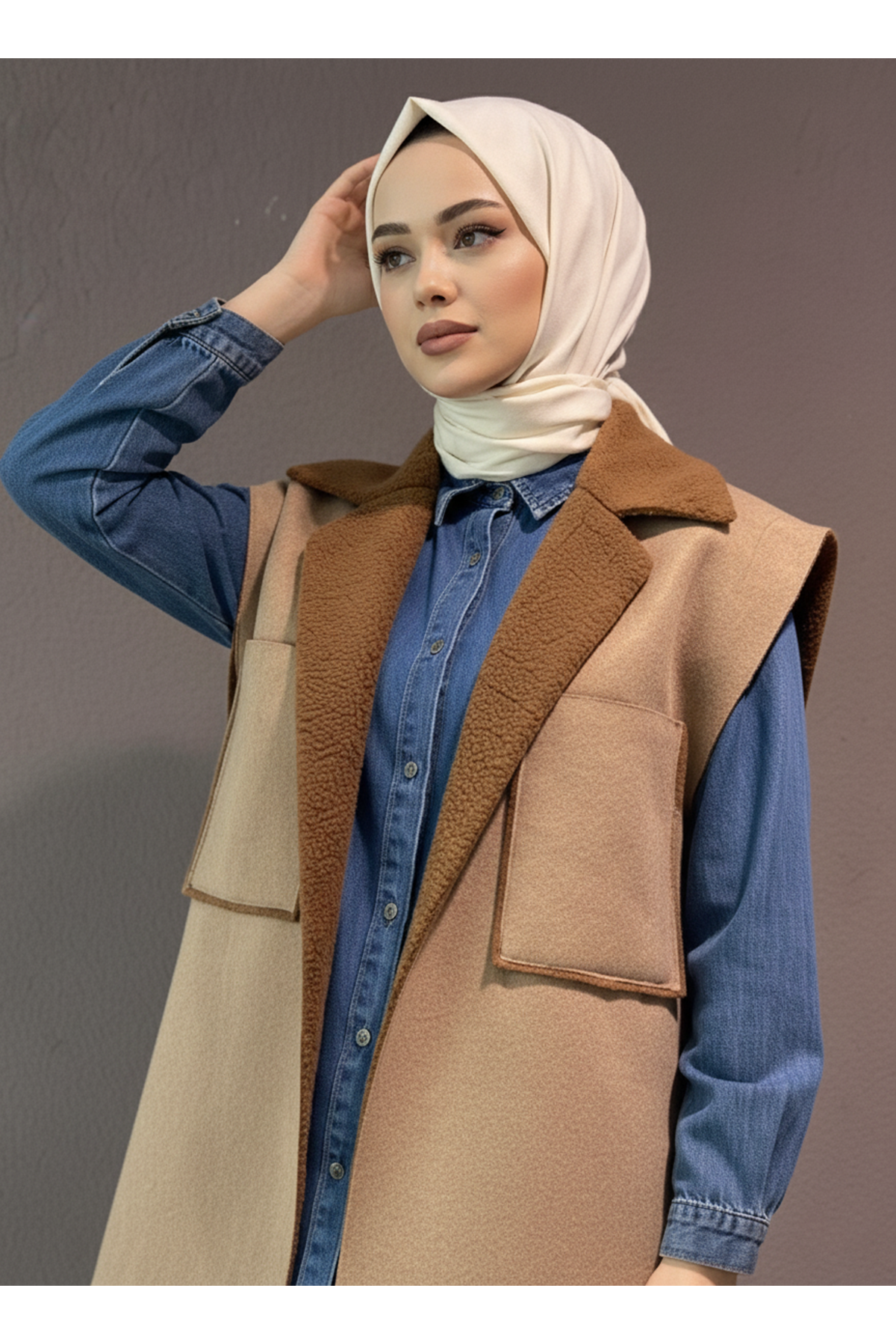 Kürklü Süet Üstten Çift Cepli Ceket-Bej