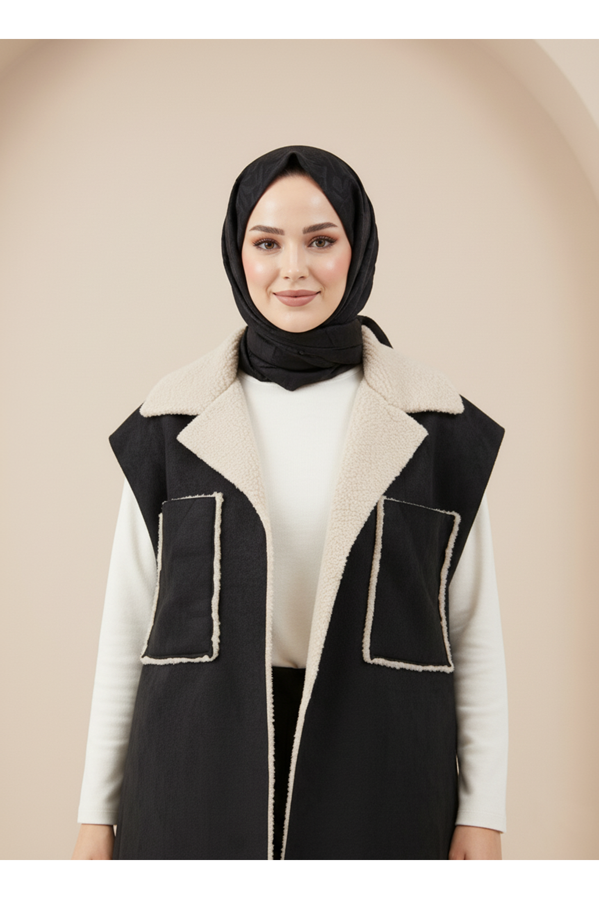 Kürklü Süet Üstten Çift Cepli Ceket-Siyah