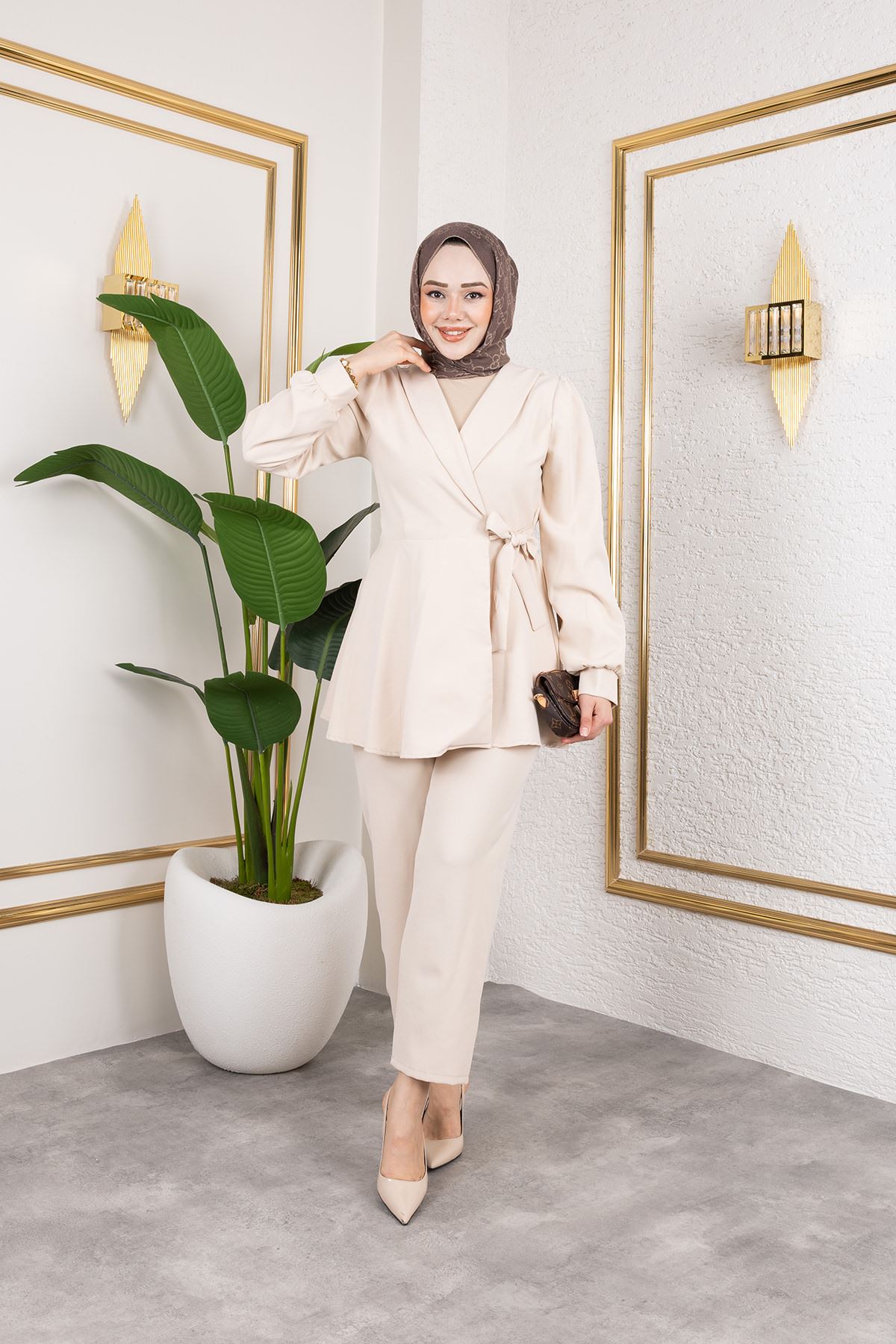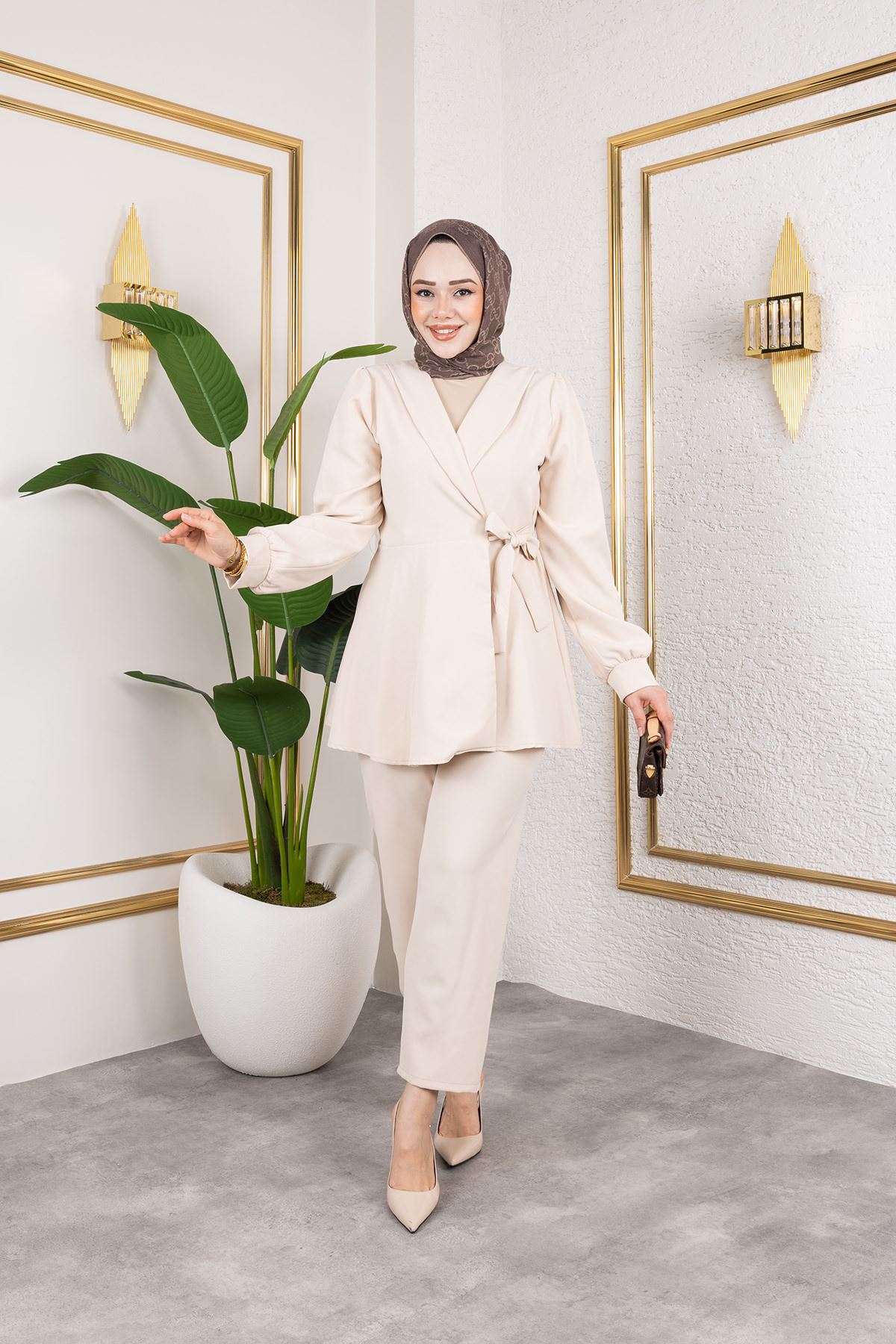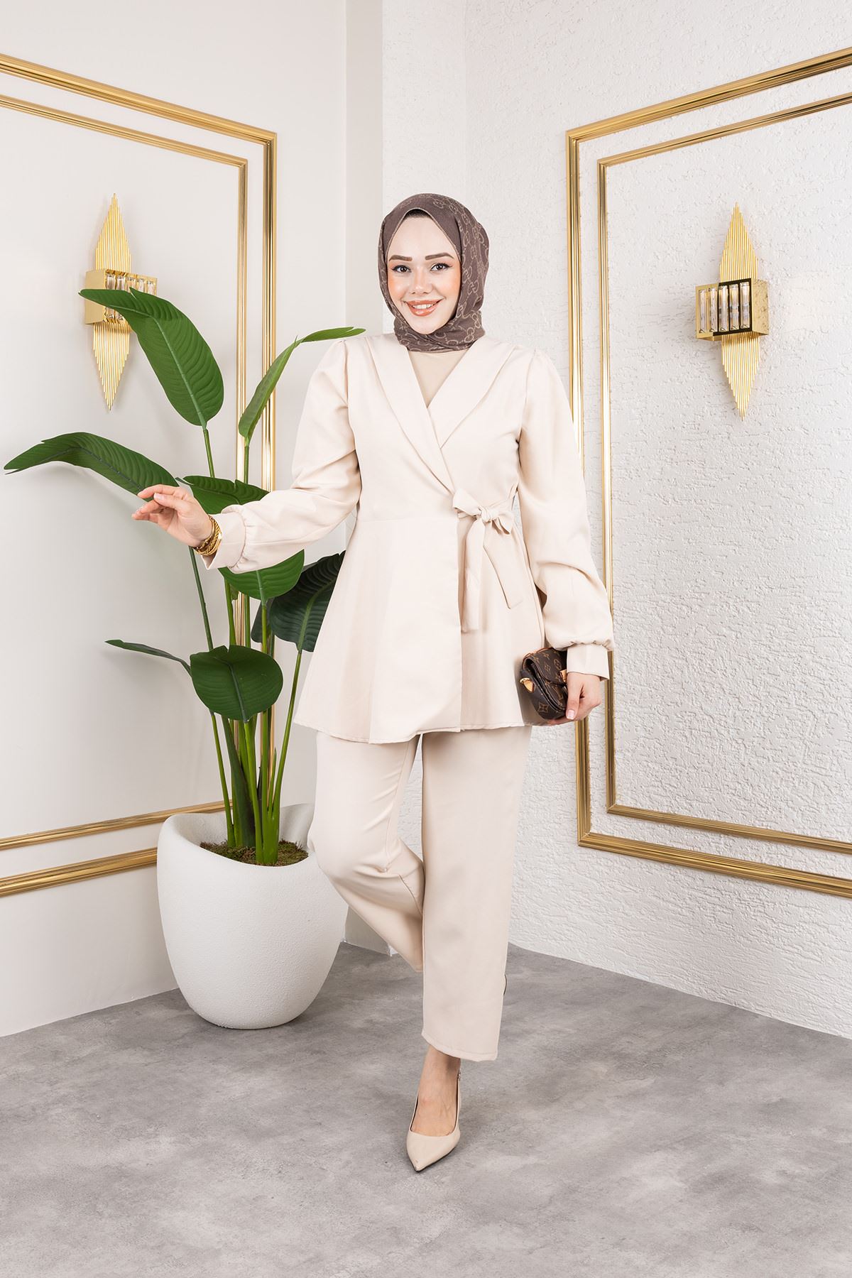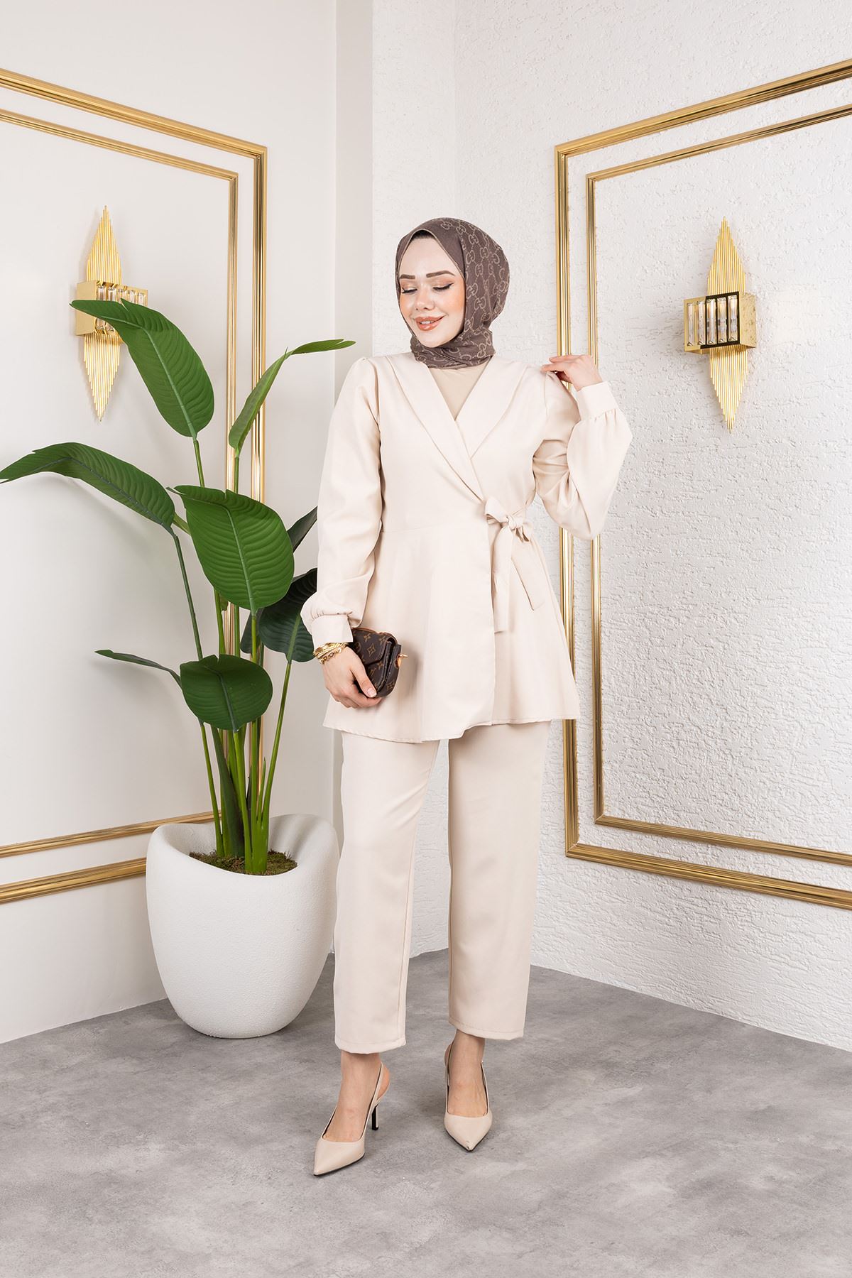 Kuşak Detay Ceketli Takım