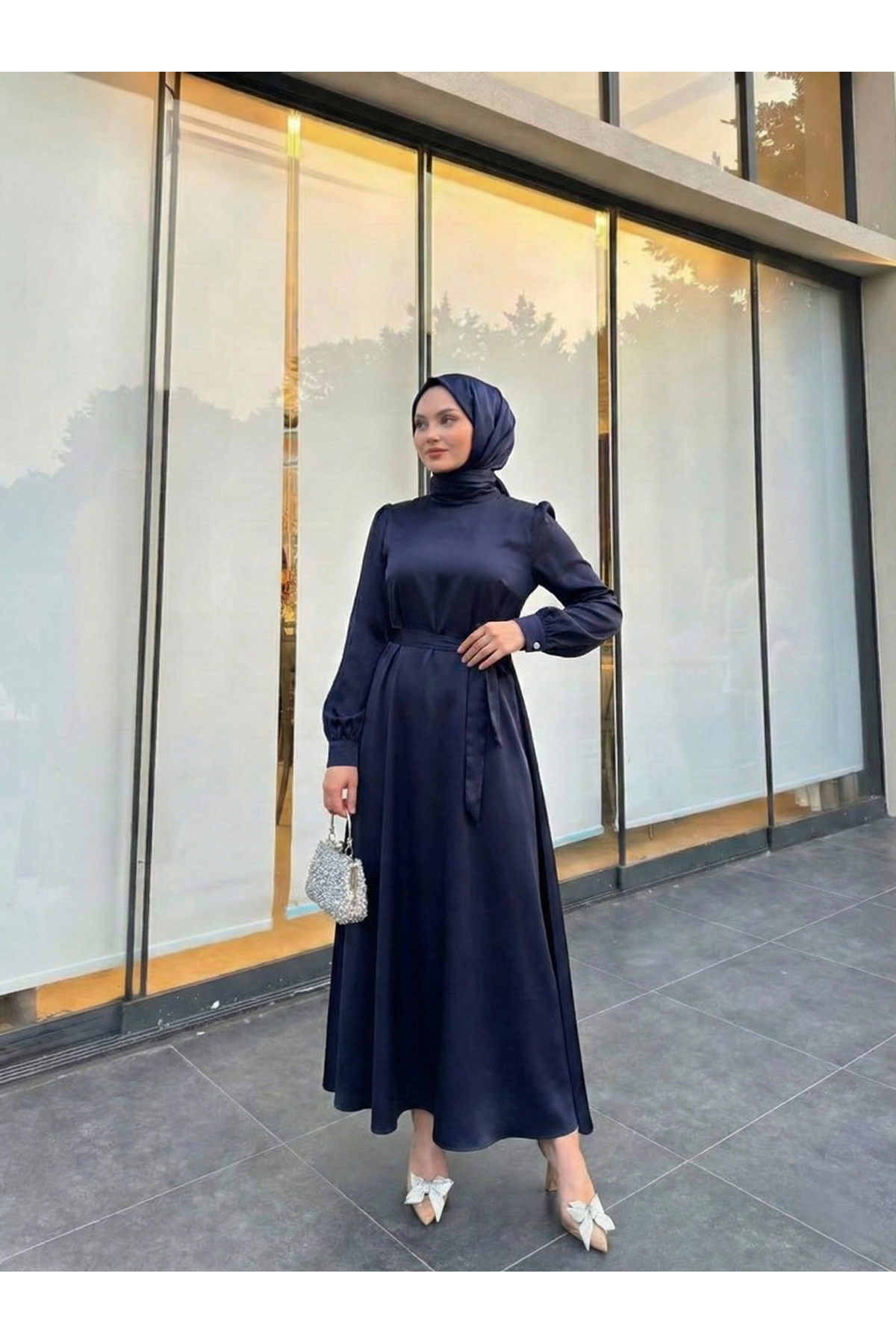 Kuşak Detay Saten Elbise-Lacivert