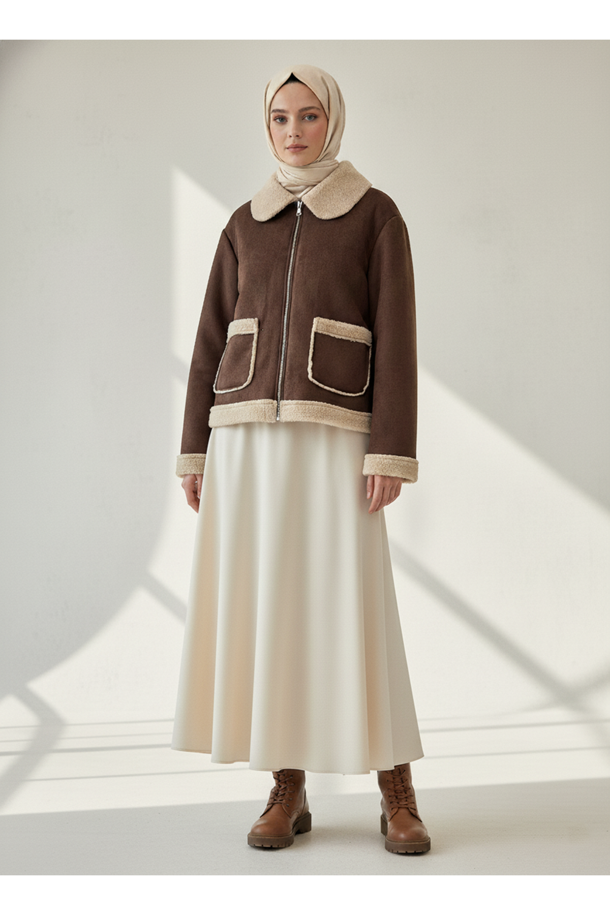 Metal Fermuar Detaylı Üstten Cepli Kaban-Kahve