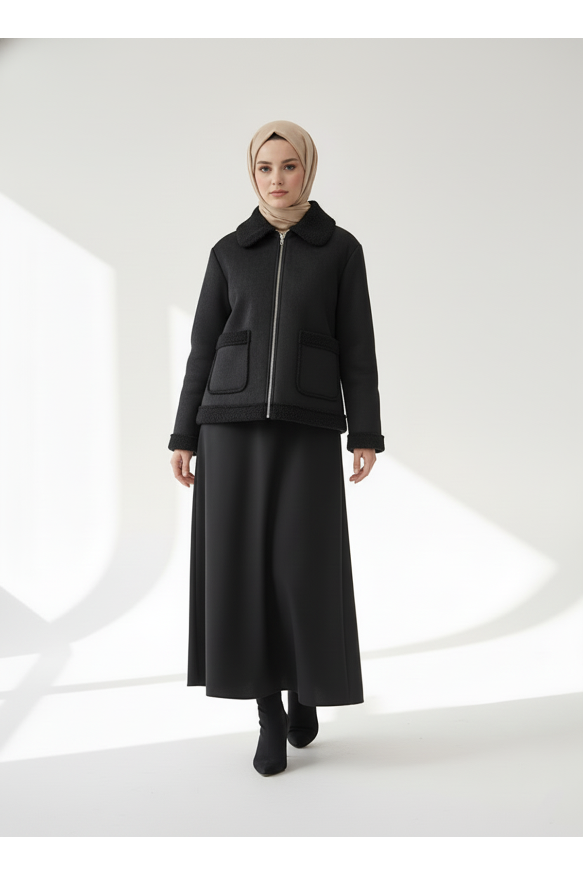 Metal Fermuar Detaylı Üstten Cepli Kaban-Siyah