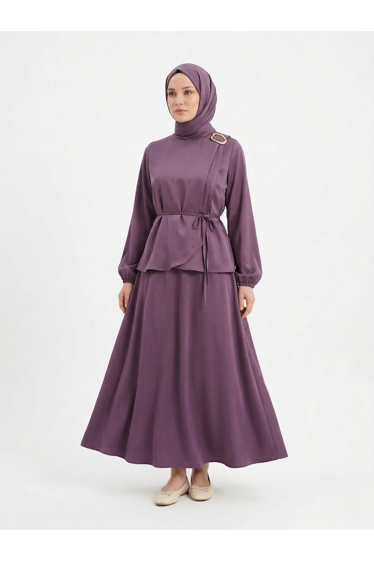 Omuz Aksesuar Detay Saten Etekli Takım-Mürdüm