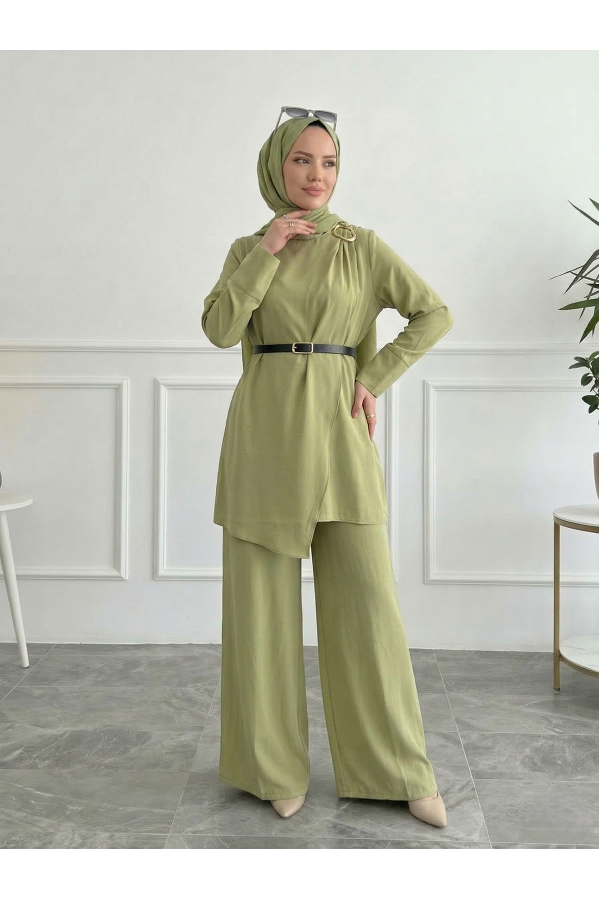 Omuz Aksesuar Pile DetayPantolonlu Takım-YAĞ YEŞİLİ