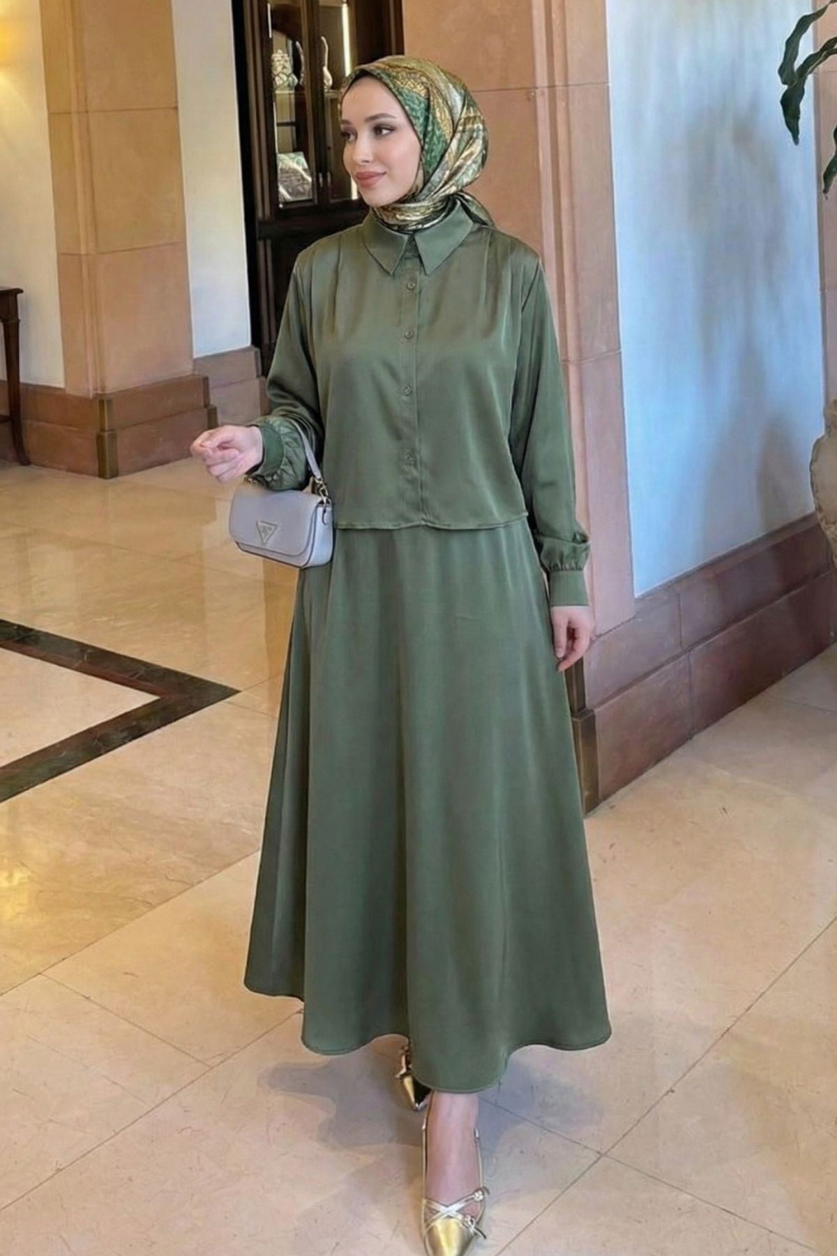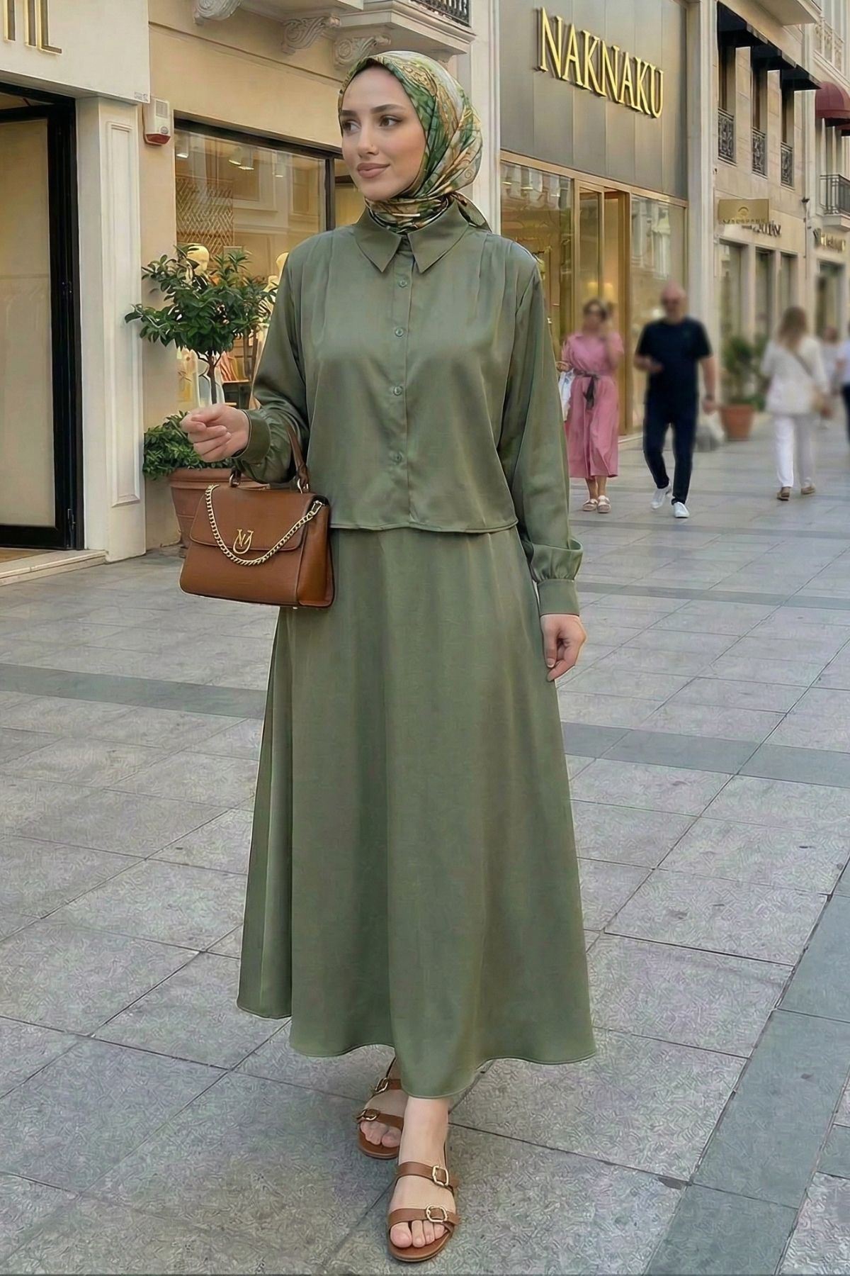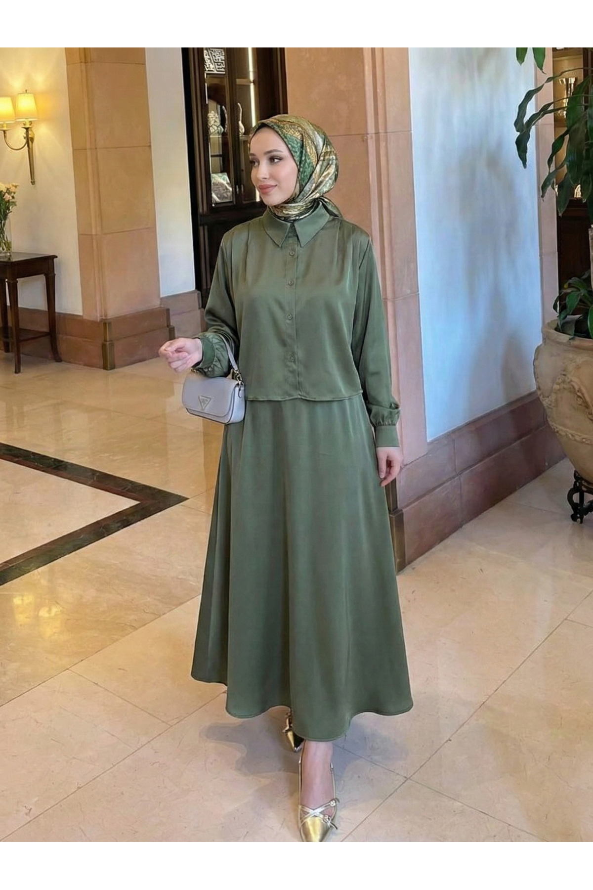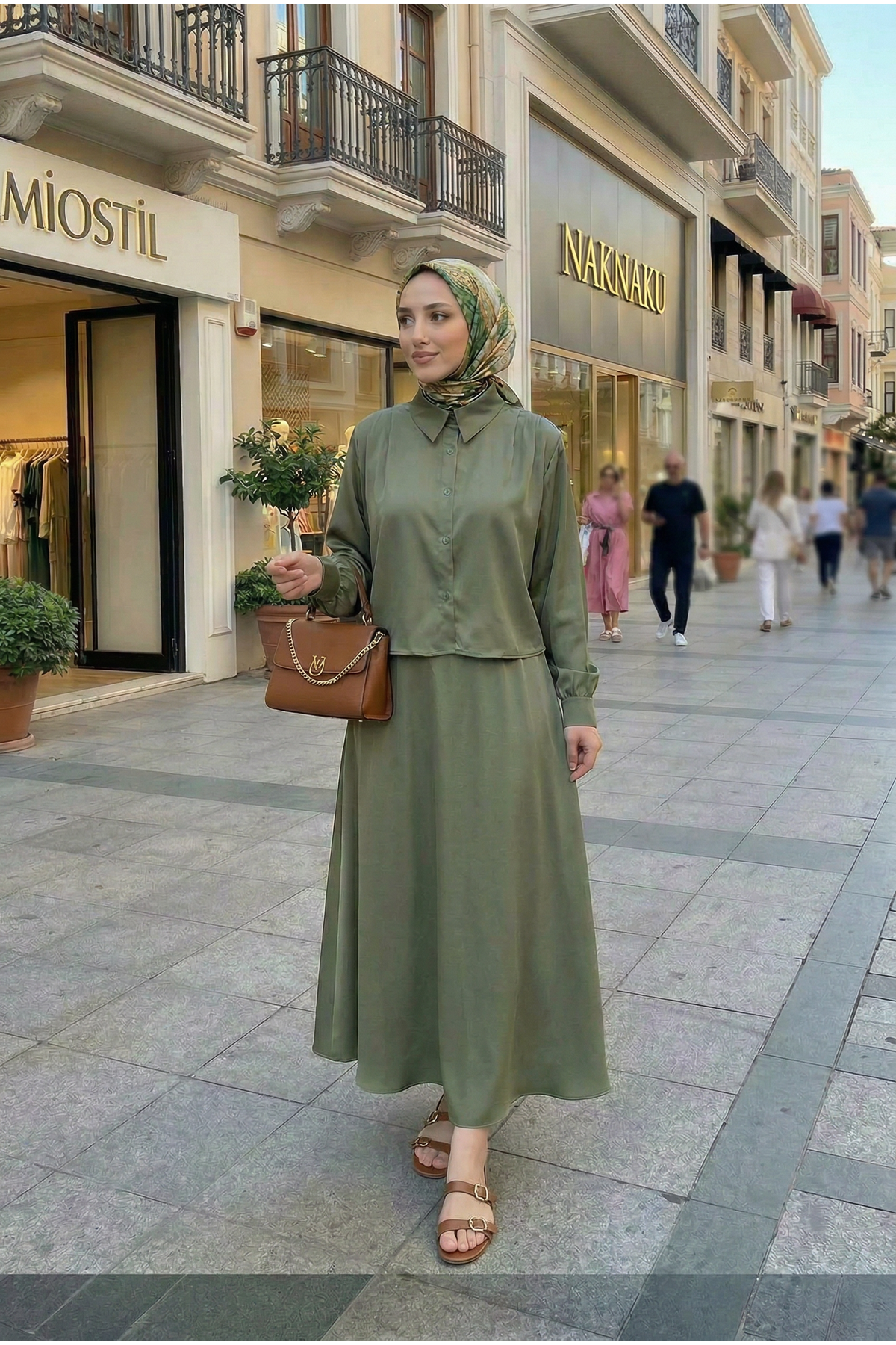• Tasarım Detayları: Gömlek, manşetli kolları ve gizli/şık düğme detaylarıyla modern bir görünüme sahiptir. Etek, dökümlü kesimiyle hareket özgürlüğü sağlar ve vücut hatlarını belli etmez (Modest Giyim uyumludur).