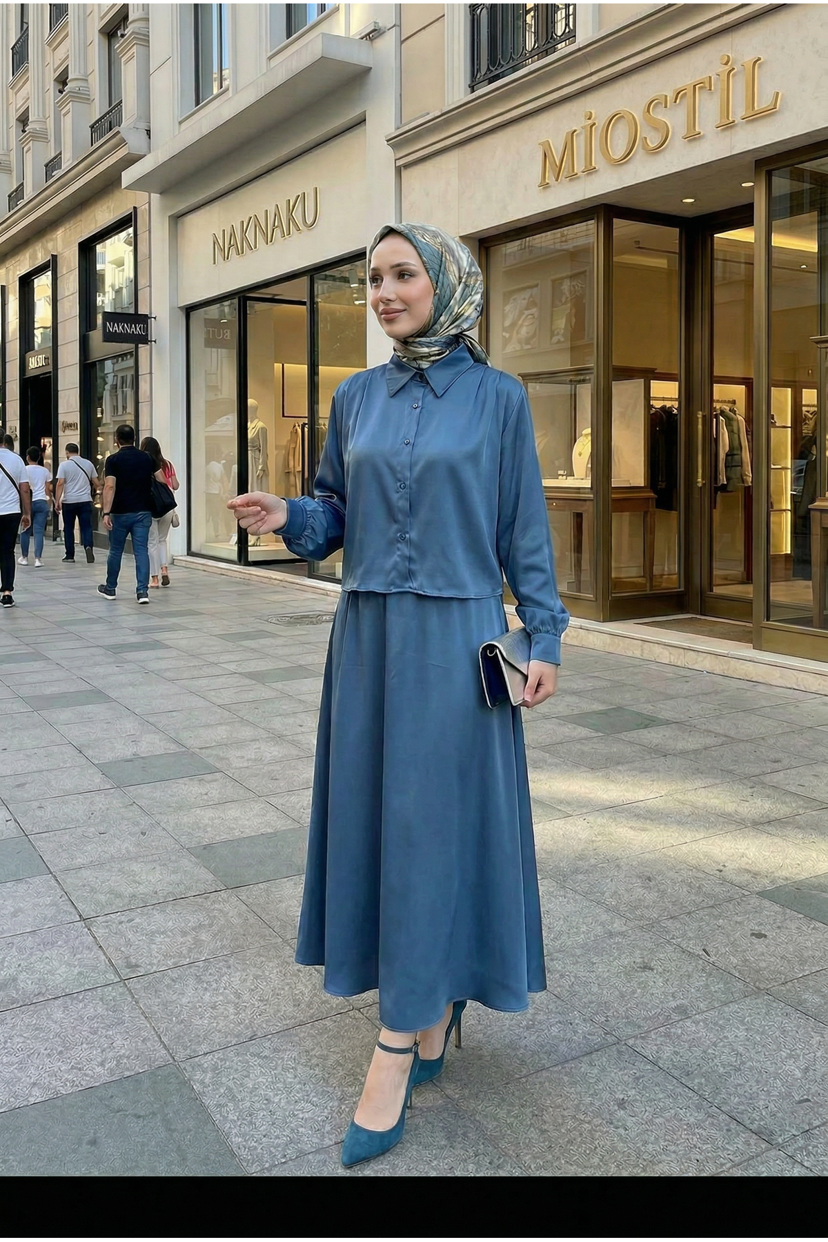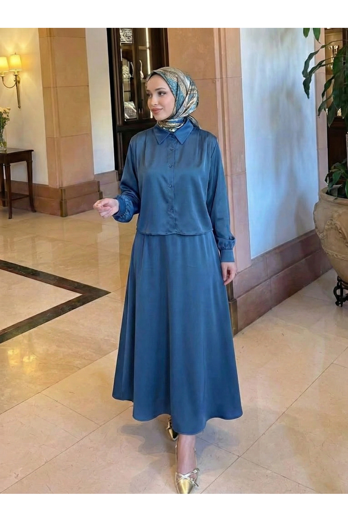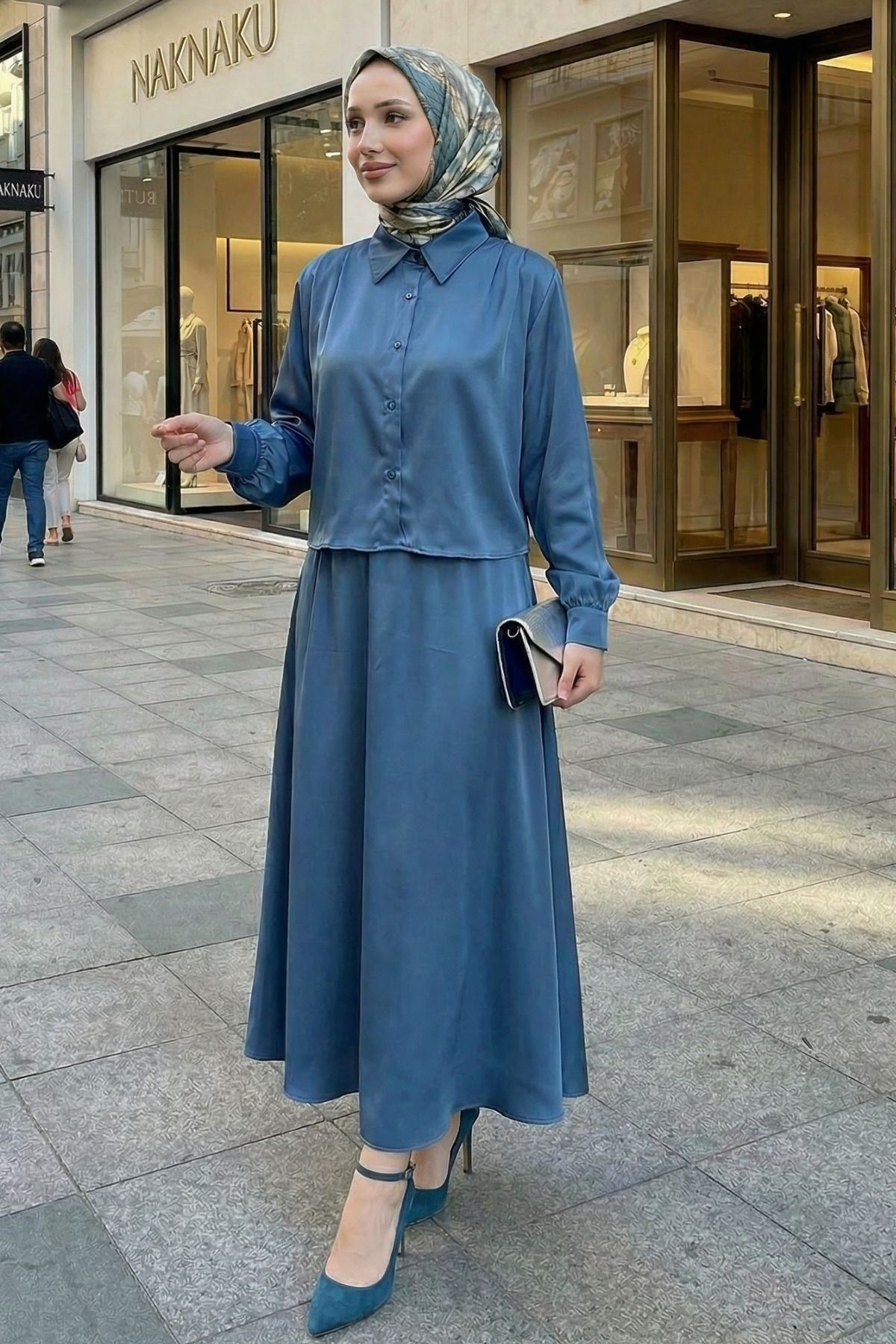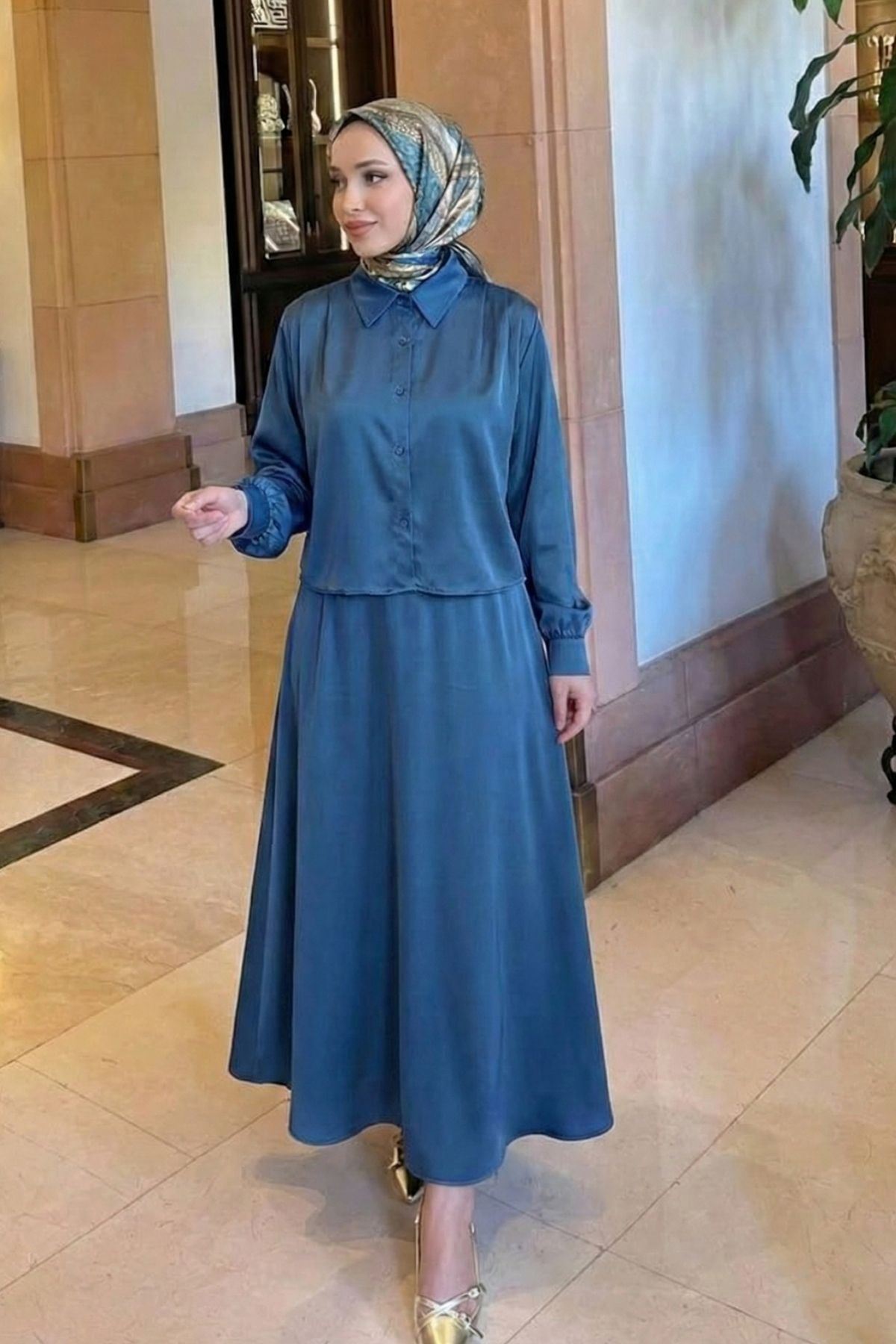 - Tasarım Detayları: Gömlek, manşetli kolları ve gizli/şık düğme detaylarıyla modern bir görünüme sahiptir. Etek, dökümlü kesimiyle hareket özgürlüğü sağlar ve vücut hatlarını belli etmez (Modest Giyim uyumludur).