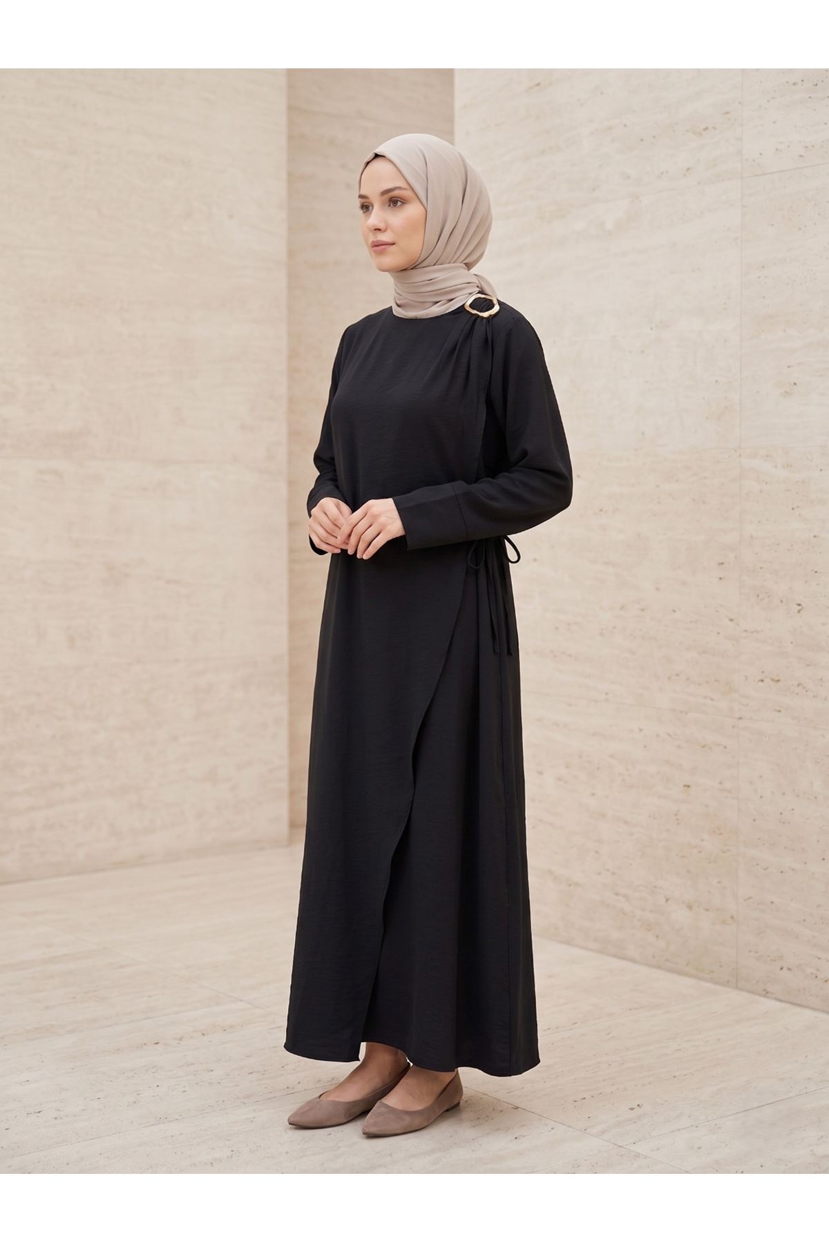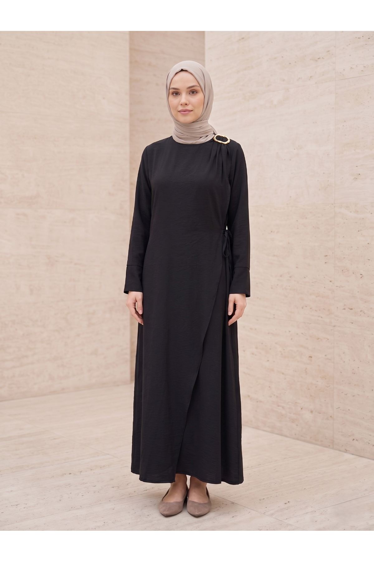 Omuz Pile Toka Detay Elbise-Siyah