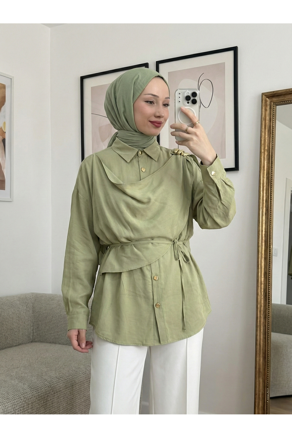 Omuz Toka Detay Aller Tunik-YAĞ YEŞİLİ
