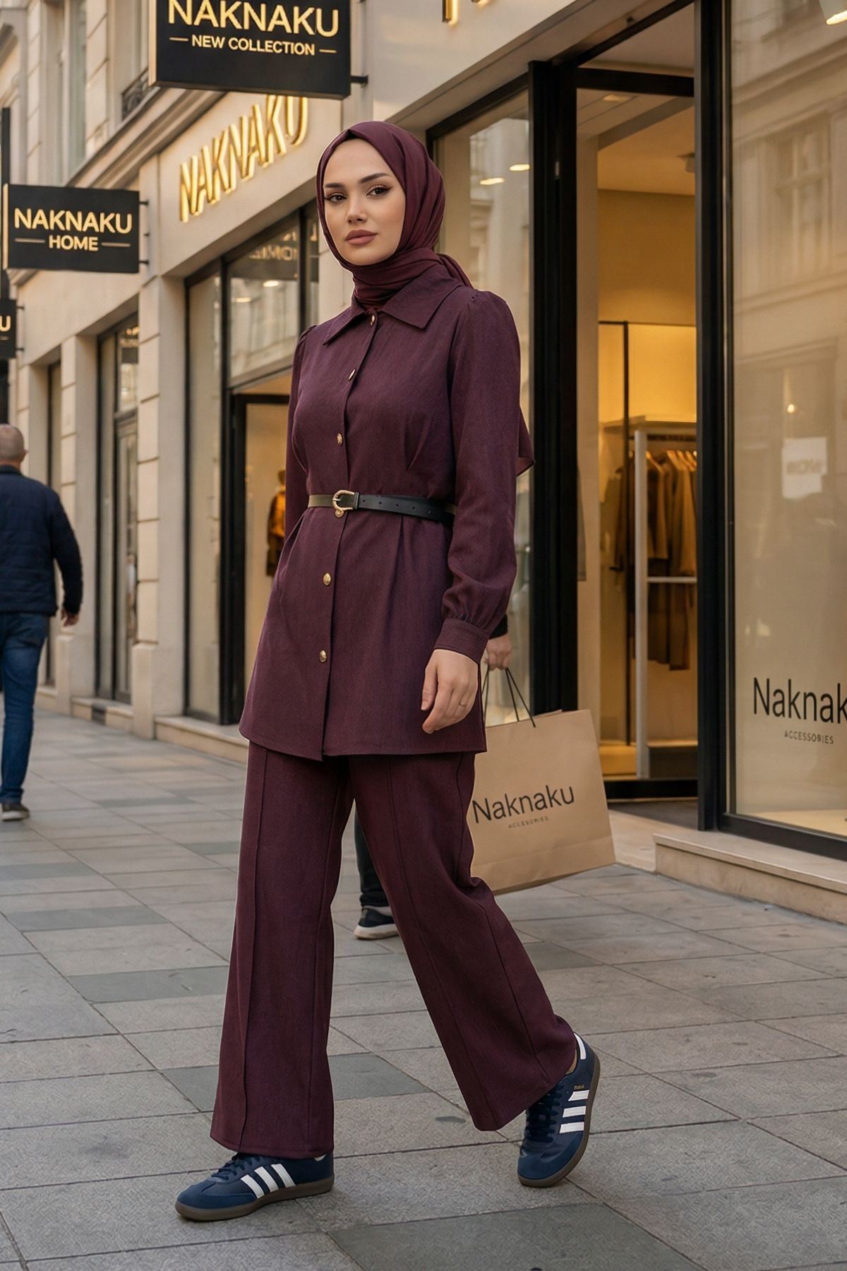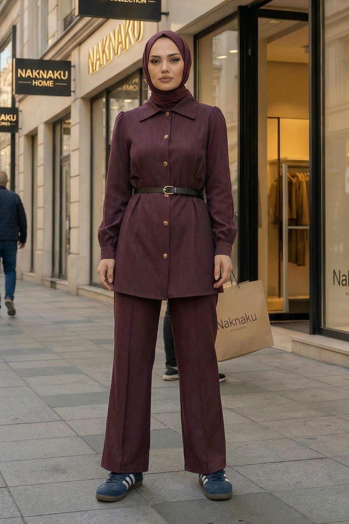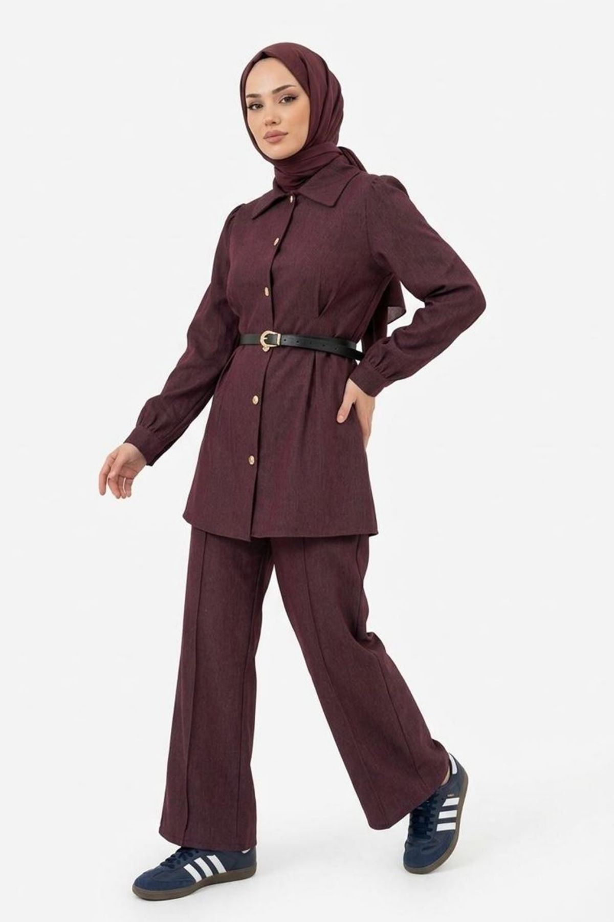 Modern ve zarif tasarımıyla öne çıkan kemerli tesettür ikili takım modeli hem günlük kullanım hem ofis kombinleri için ideal bir tercihtir. Gömlek yaka detayı ve bel kemeri sayesinde vücuda dengeli ve şık bir görünüm kazandırır. Rahat kesim pantolon yapısı gün boyu konfor sağlar.