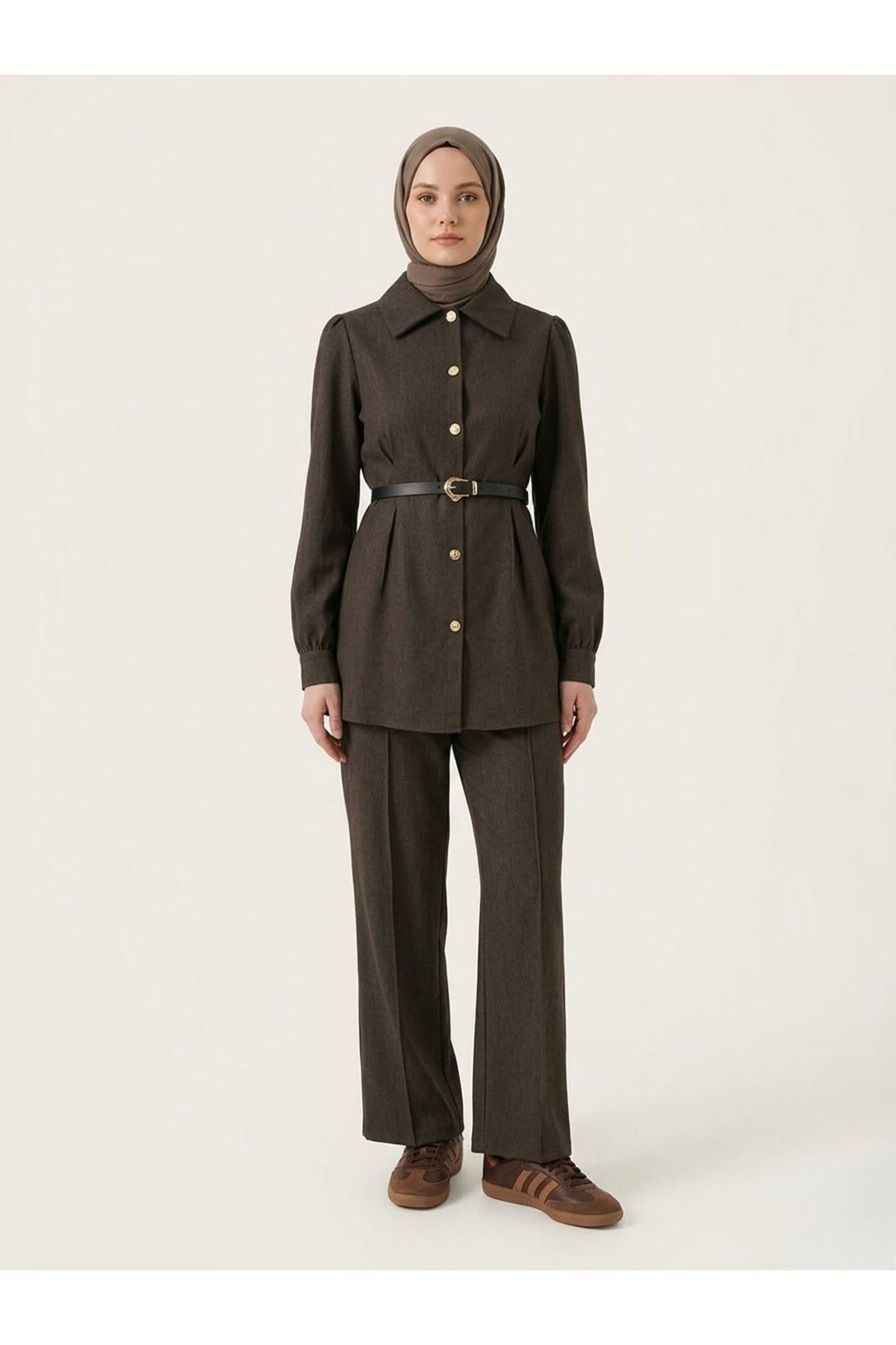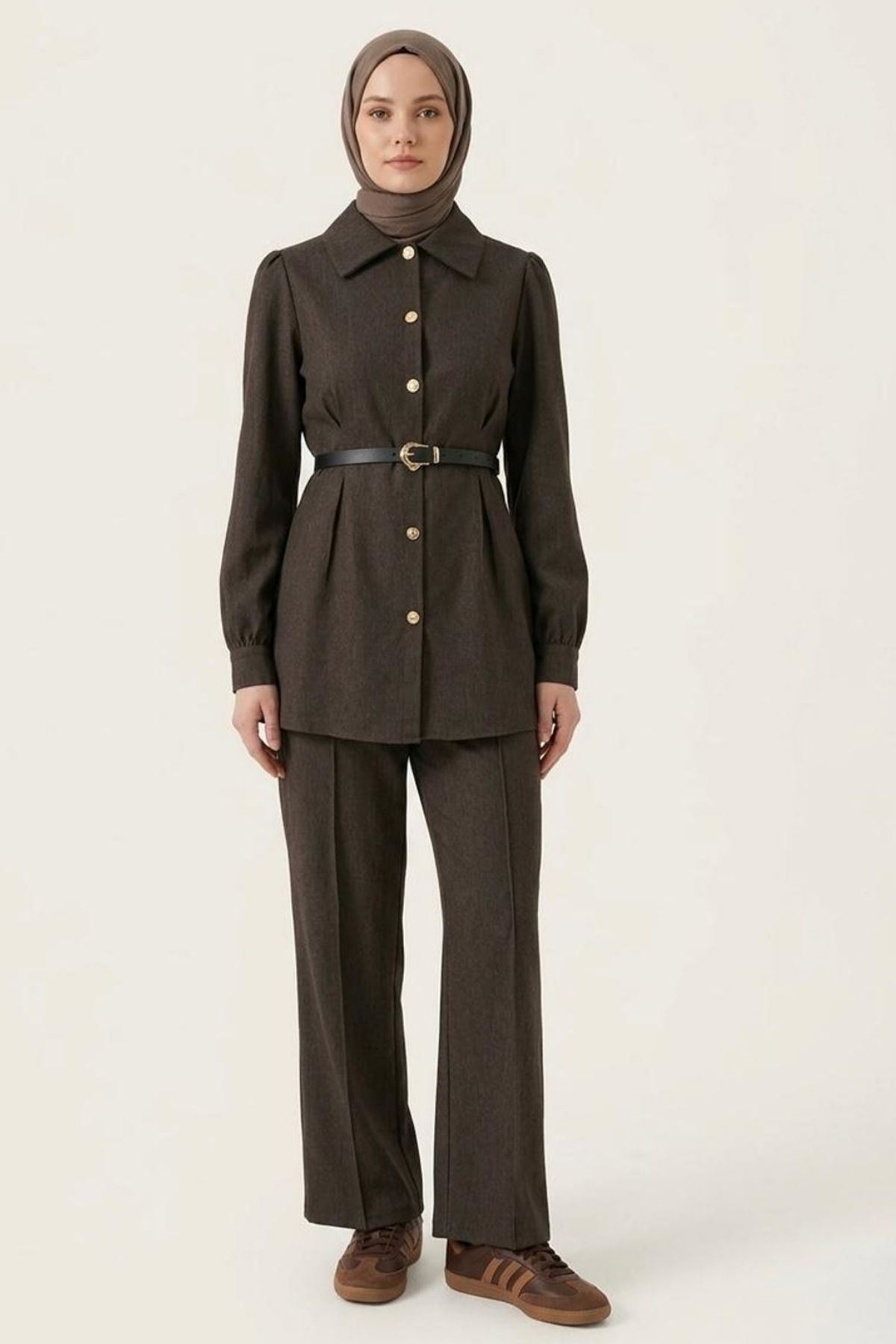 Modern ve zarif tasarımıyla öne çıkan kemerli tesettür ikili takım modeli hem günlük kullanım hem ofis kombinleri için ideal bir tercihtir. Gömlek yaka detayı ve bel kemeri sayesinde vücuda dengeli ve şık bir görünüm kazandırır. Rahat kesim pantolon yapısı gün boyu konfor sağlar.