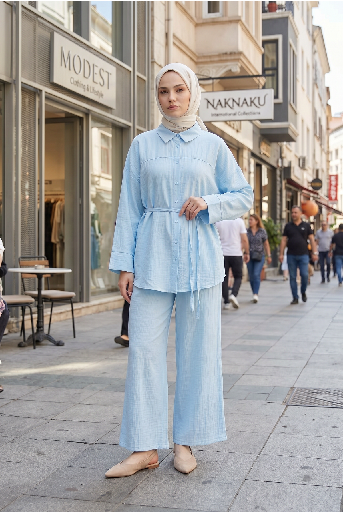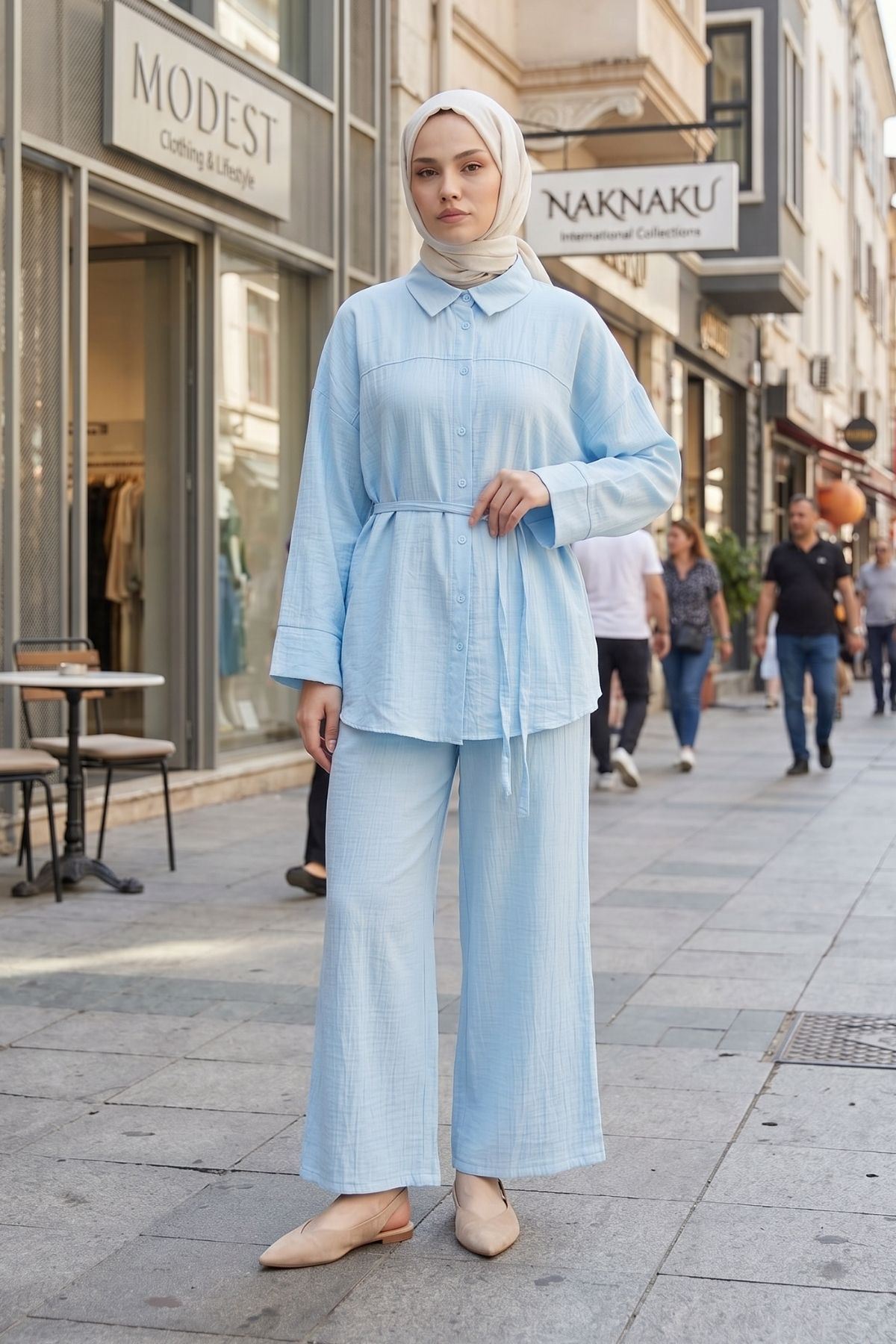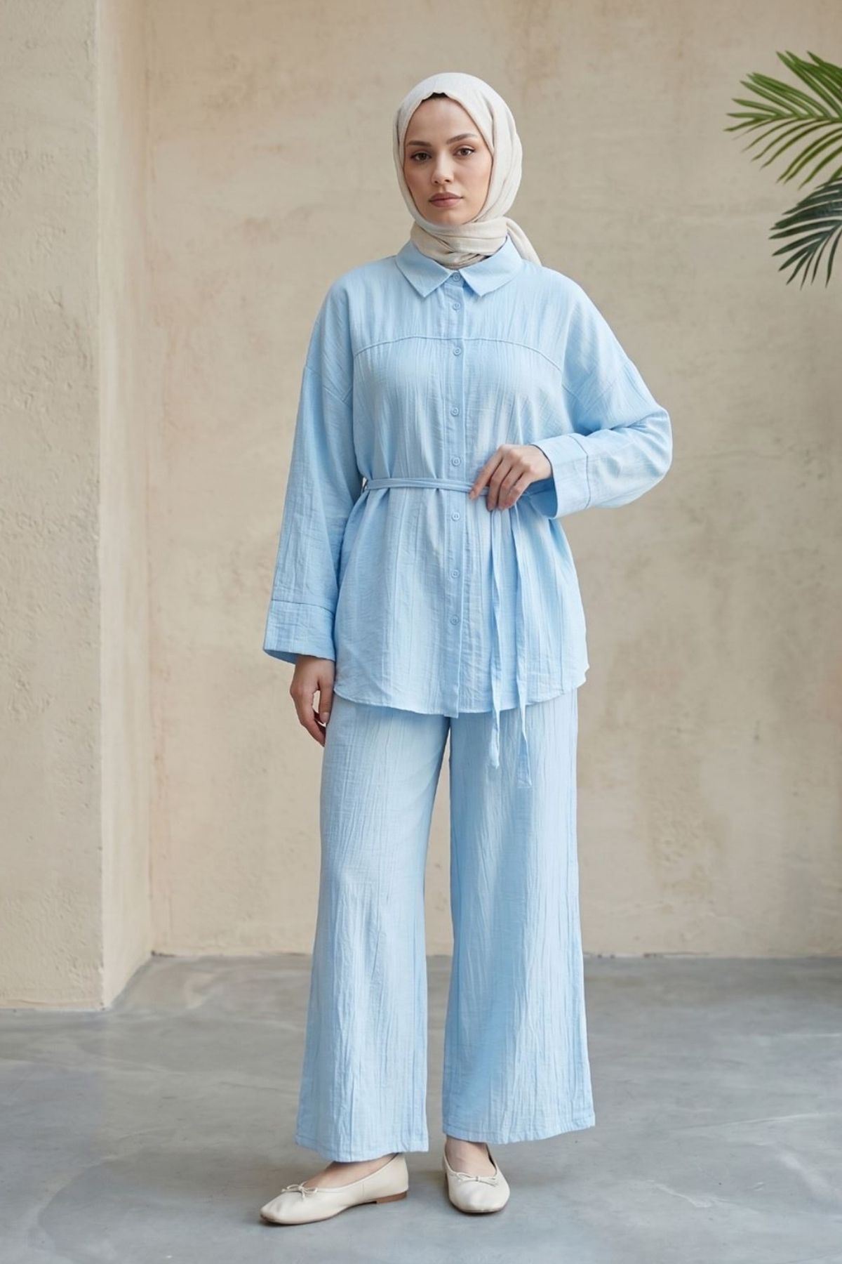 Kadın Yeni Sezon Kuşaklı İkili Tesettür Takım Bebe Mavisi Renk Rahat Kalıp Yazlık Kadın Tesettür Takım