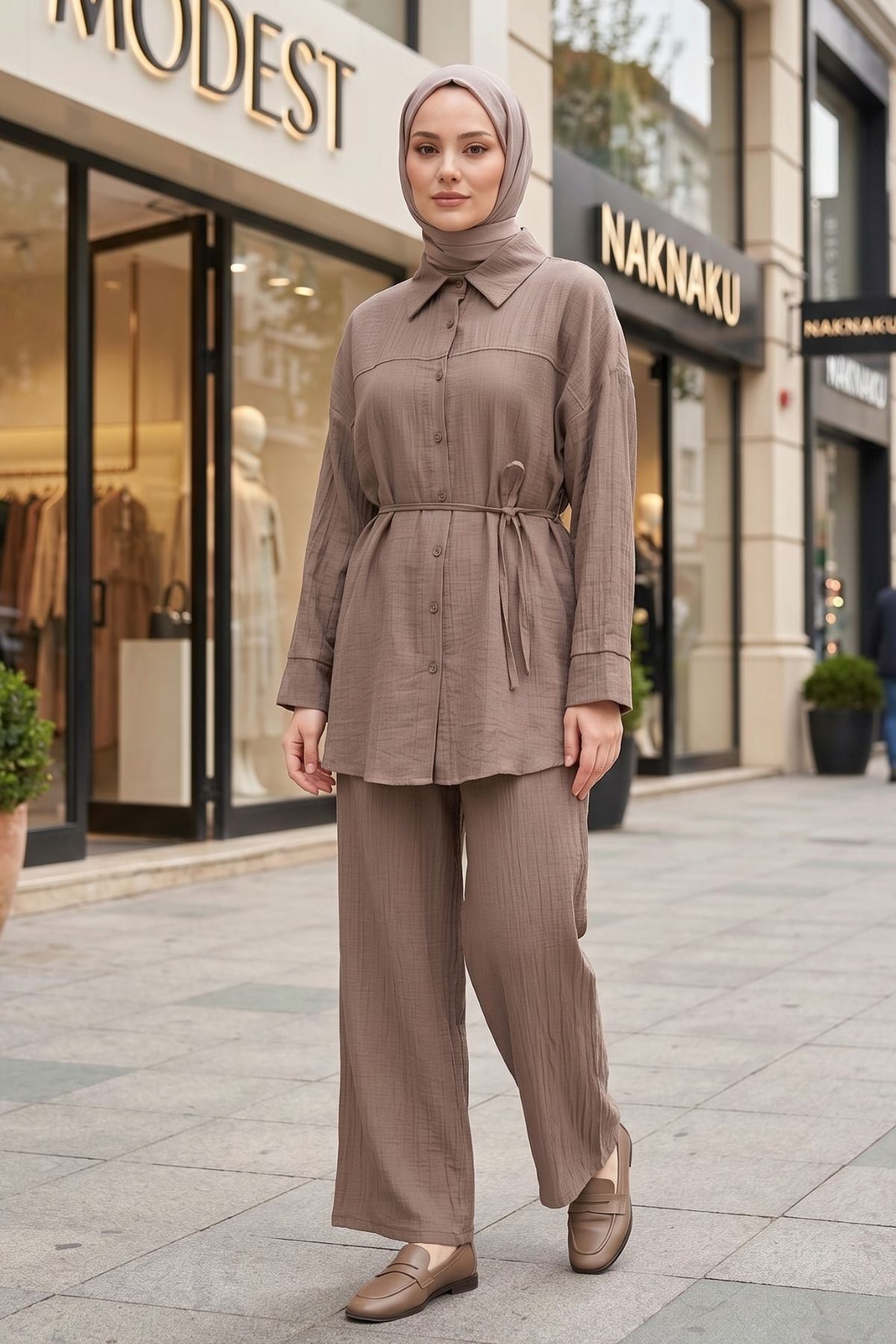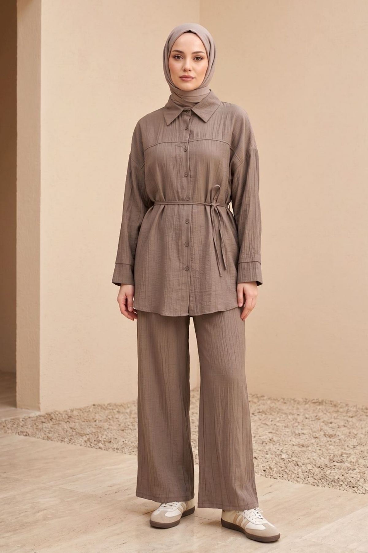 Kadın Yeni Sezon Kuşaklı İkili Tesettür Takım Duman Renk Rahat Kalıp Yazlık Kadın Tesettür Takım