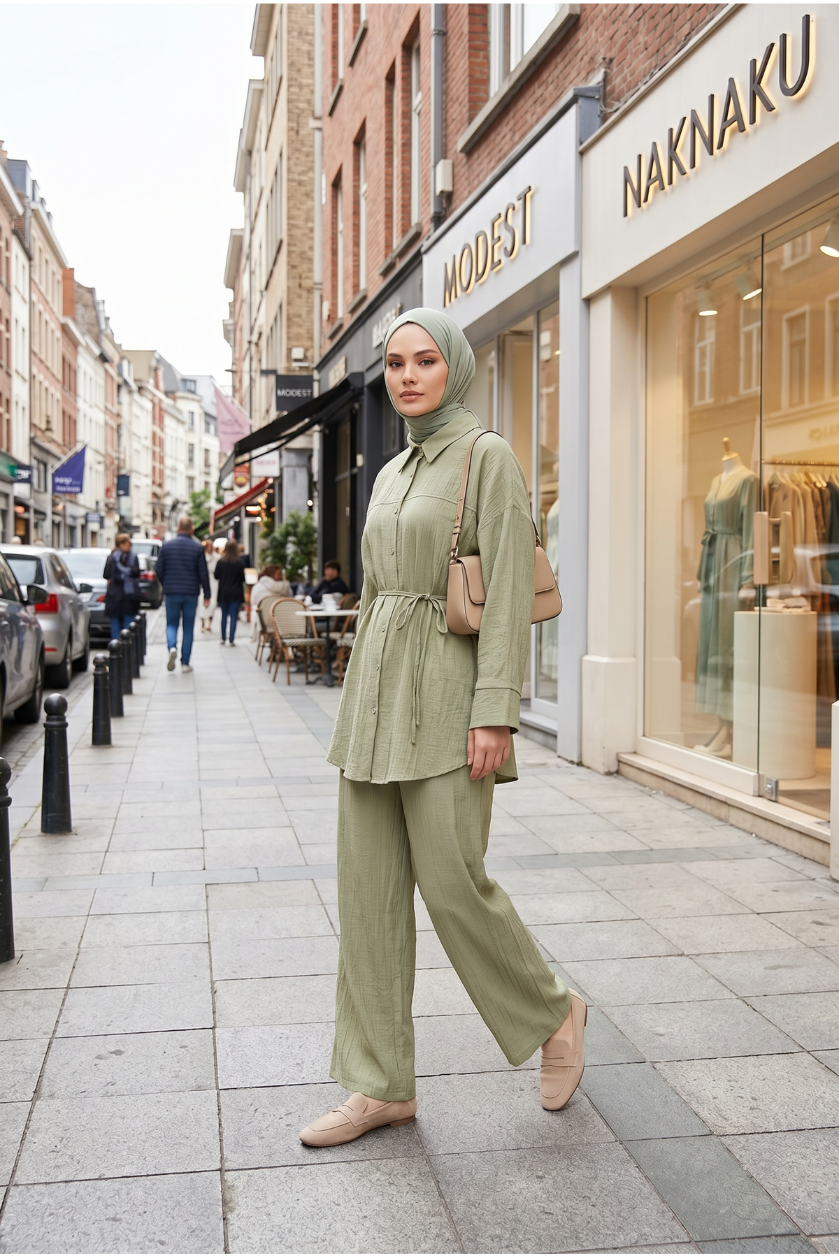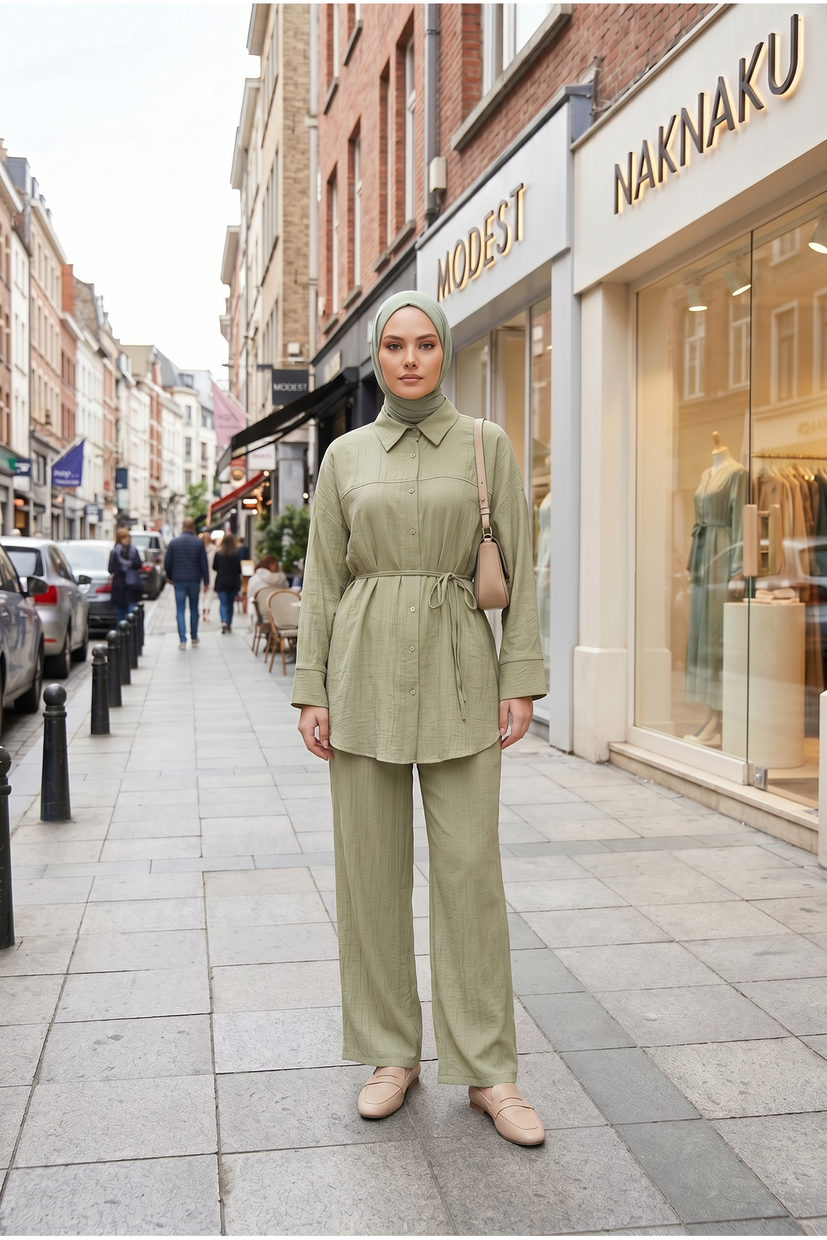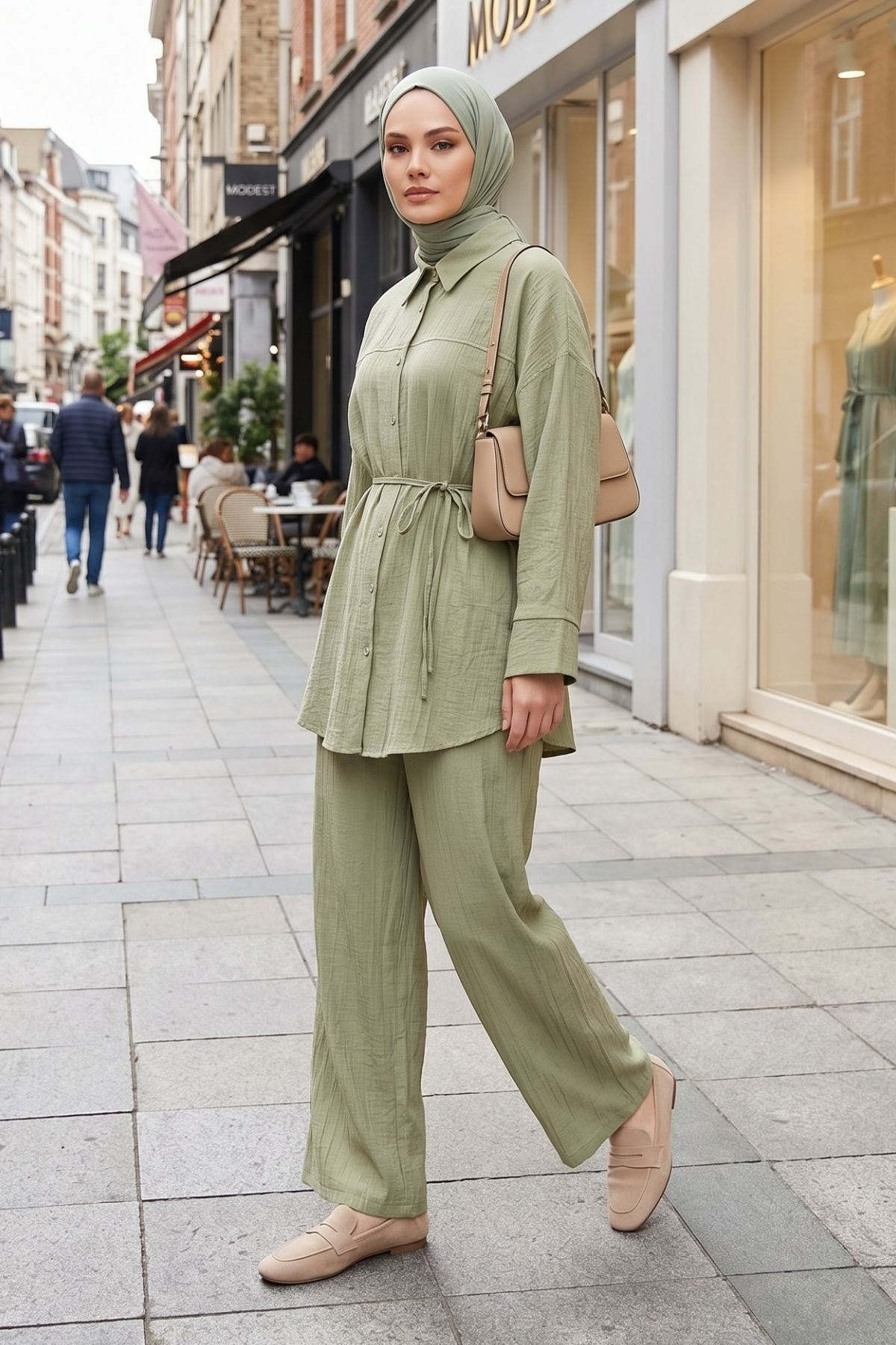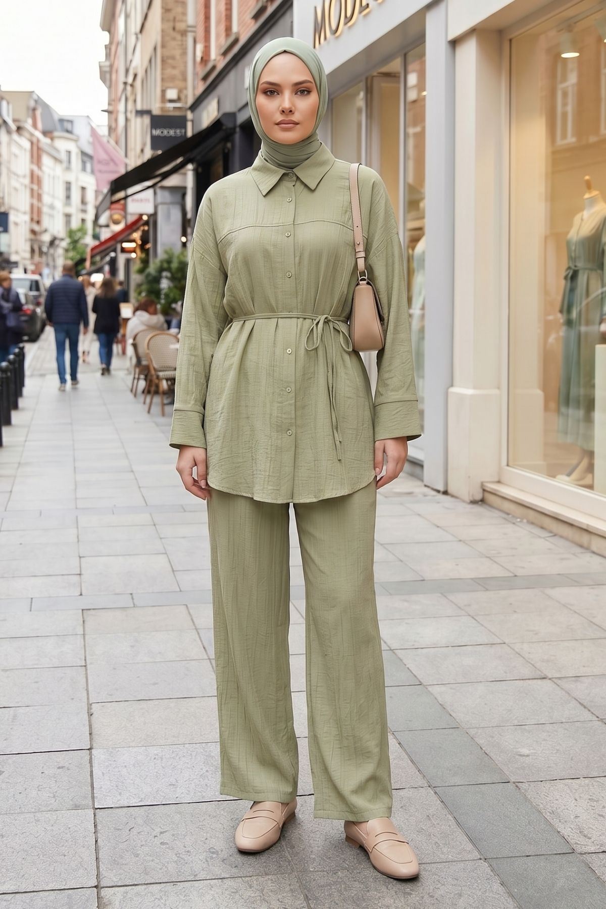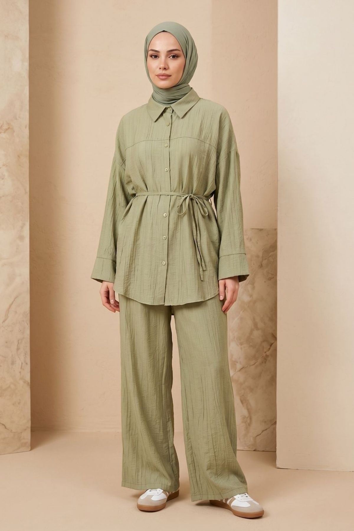 Kadın Yeni Sezon Kuşaklı İkili Tesettür Takım Haki Renk Rahat Kalıp Yazlık Kadın Tesettür Takım