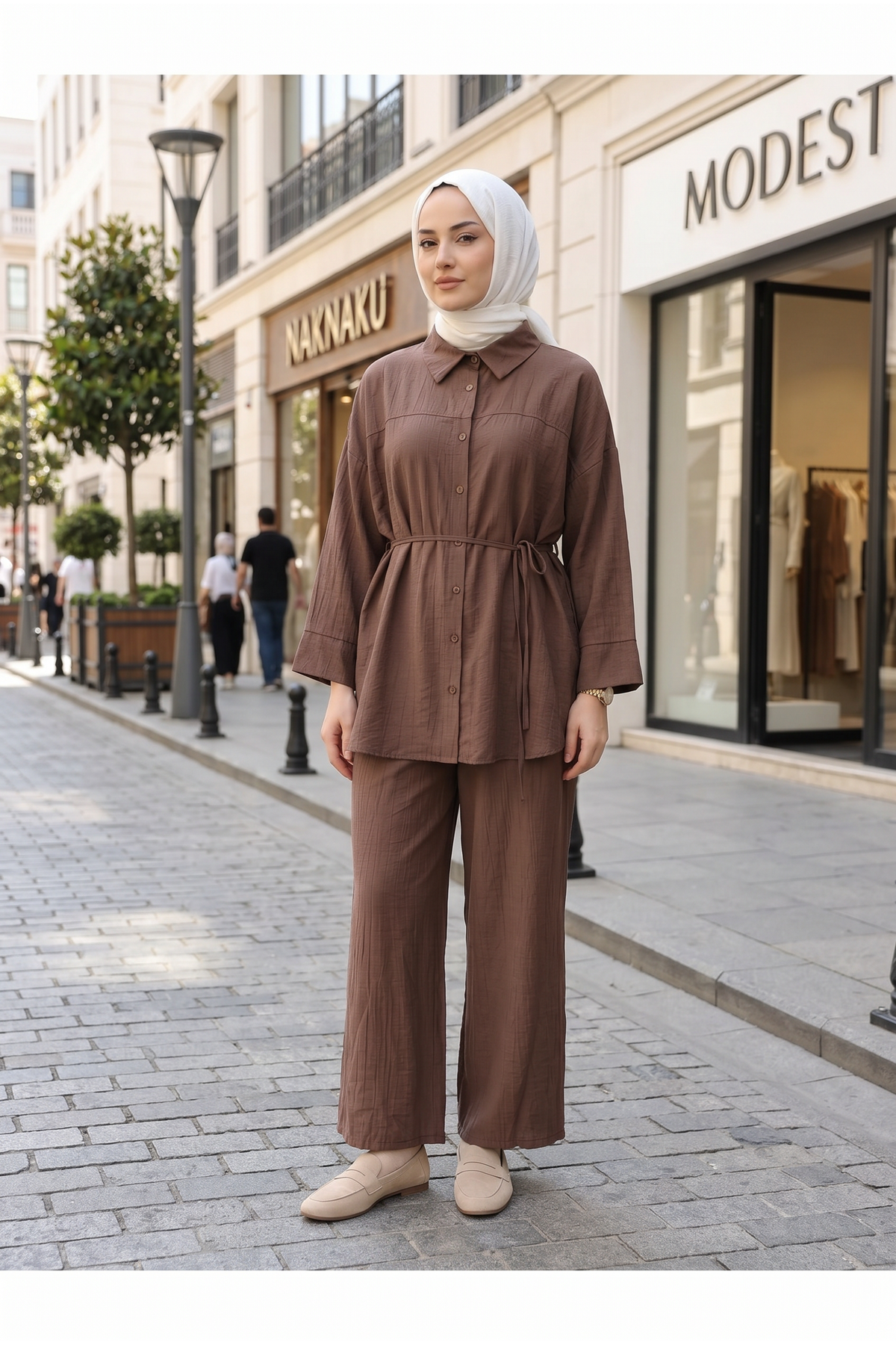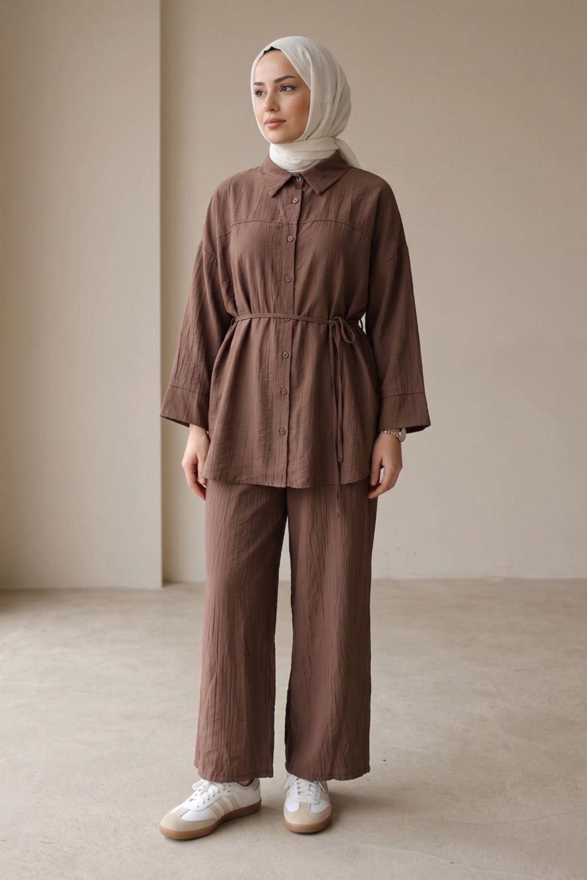 Kadın Yeni Sezon Kuşaklı İkili Tesettür Takım Kahve Renk Rahat Kalıp Yazlık Kadın Tesettür Takım