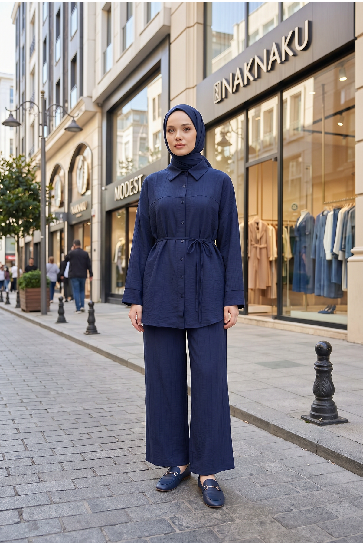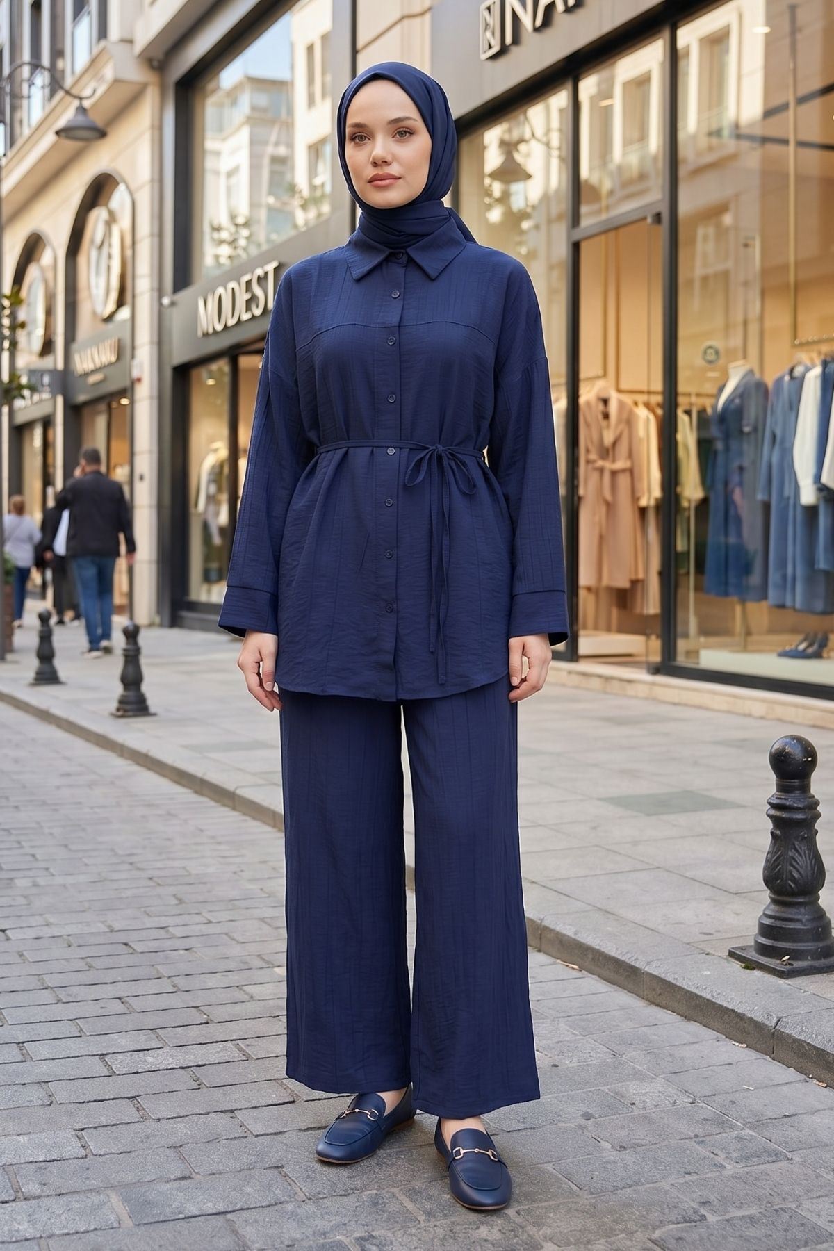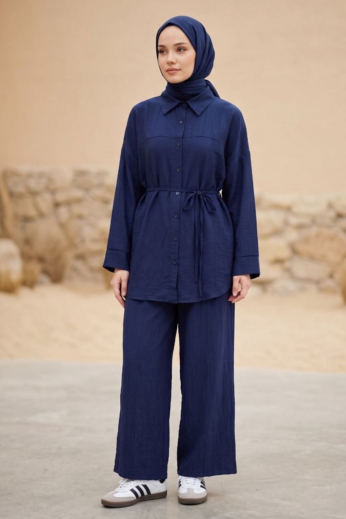 Kadın Yeni Sezon Kuşaklı İkili Tesettür Takım Lacivert Renk Rahat Kalıp Yazlık Kadın Tesettür Takım