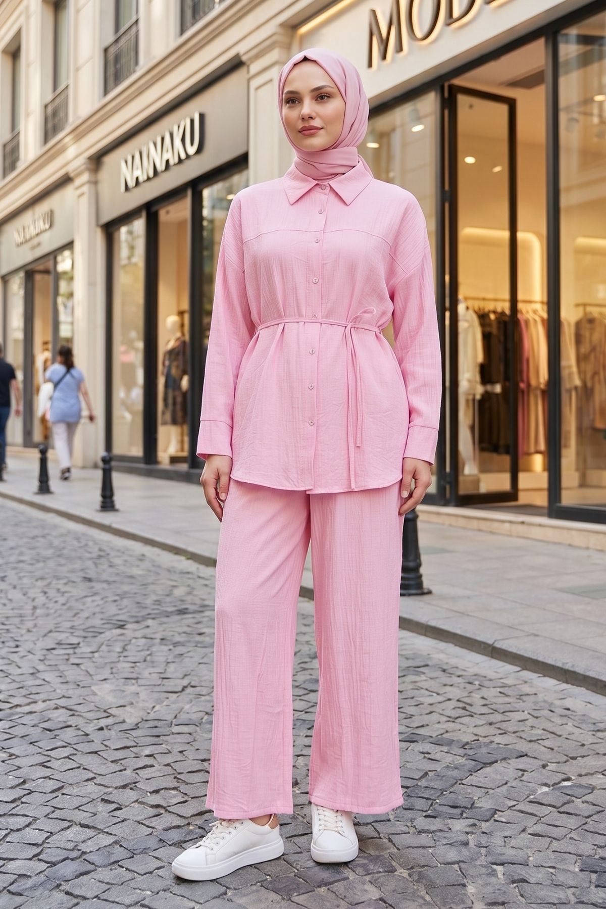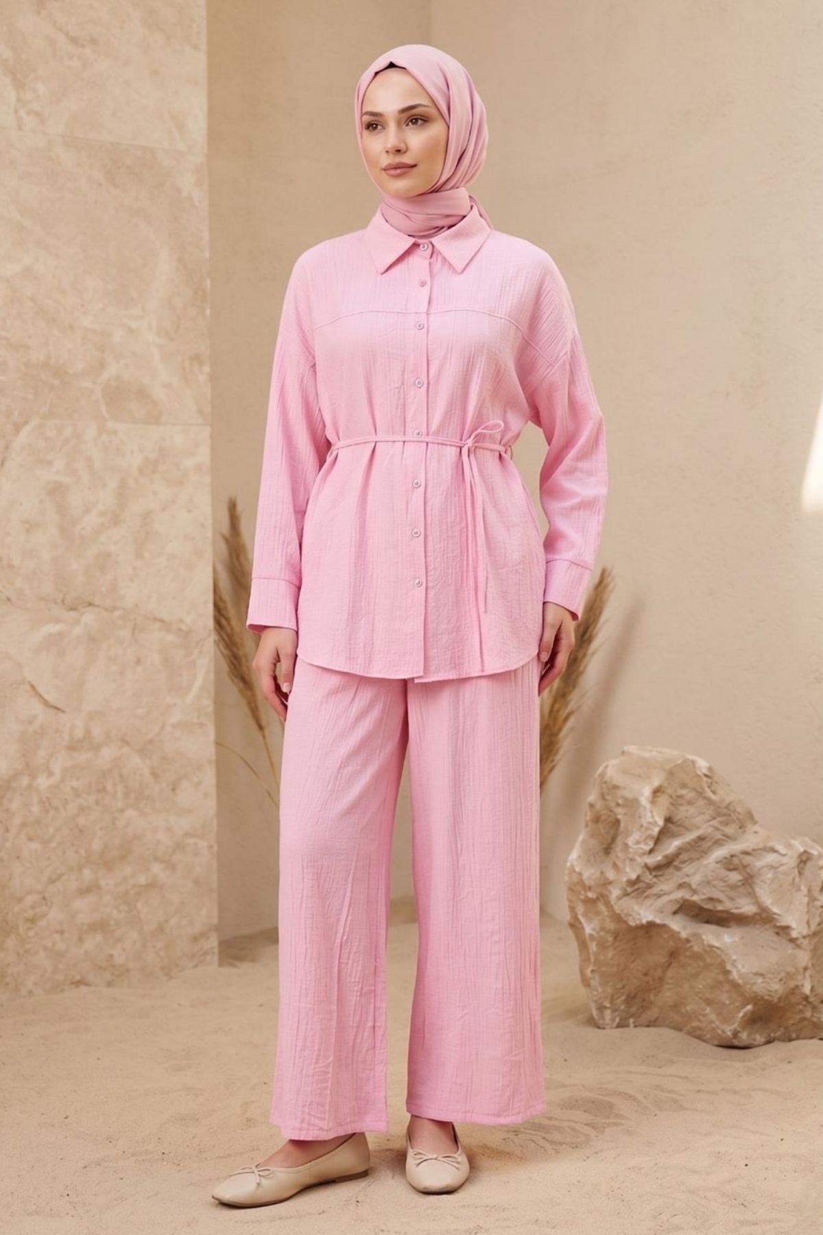 Kadın Yeni Sezon Kuşaklı İkili Tesettür Takım Pembe Renk Rahat Kalıp Yazlık Kadın Tesettür Takım