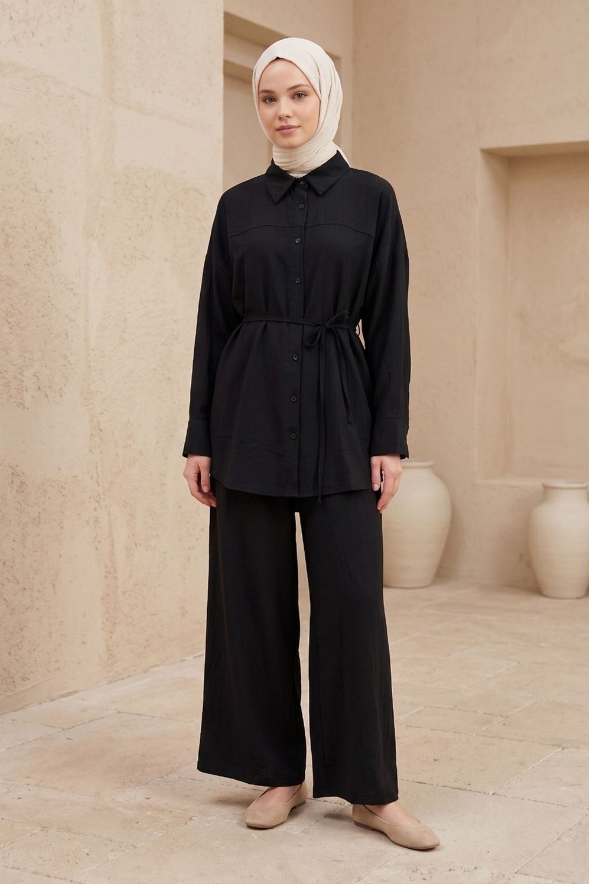 Yaz aylarının vazgeçilmez parçalarından biri olan müslin kumaş ikili tesettür takım, hafif ve nefes alabilen yapısıyla gün boyu konfor sunar. Gömlek Tunik formundaki üst parça ve rahat kesim pantolon tasarımı sayesinde hem şık hem kullanışlı bir kombin oluşturur.
