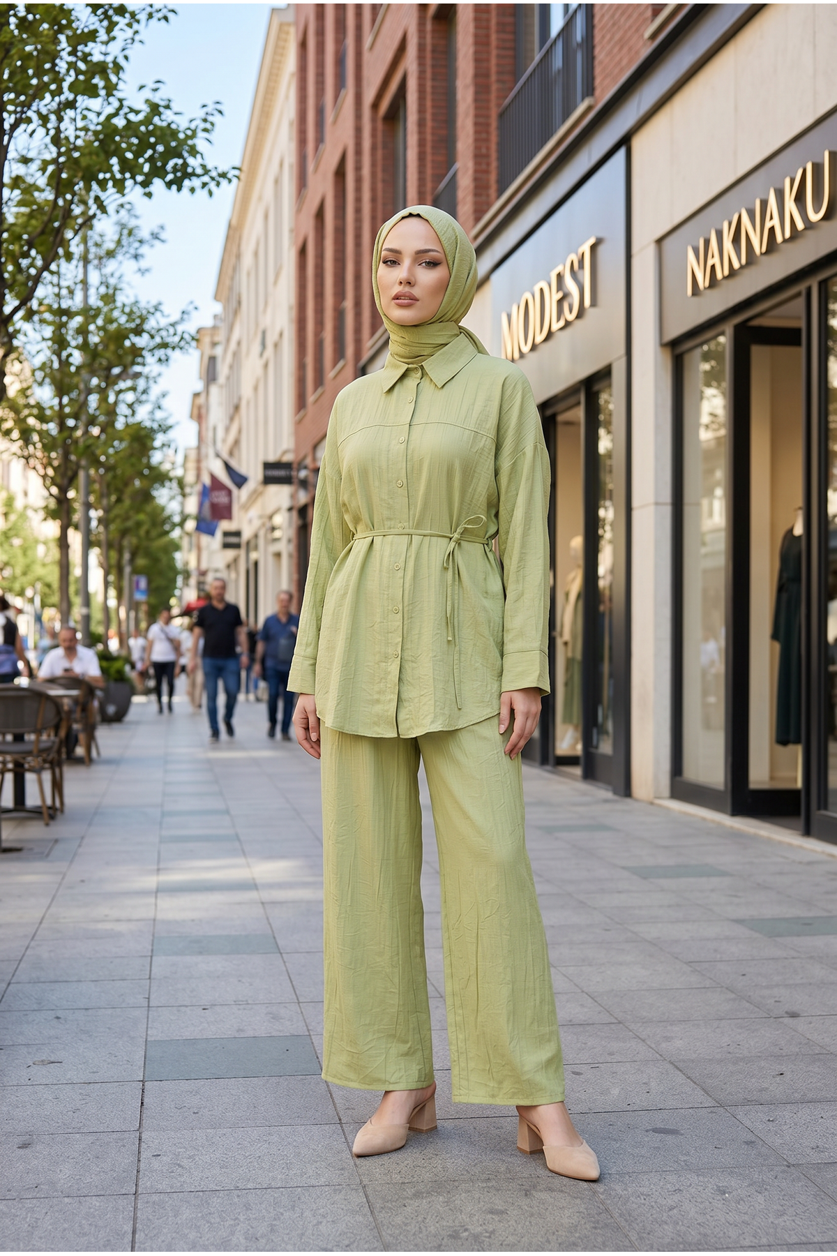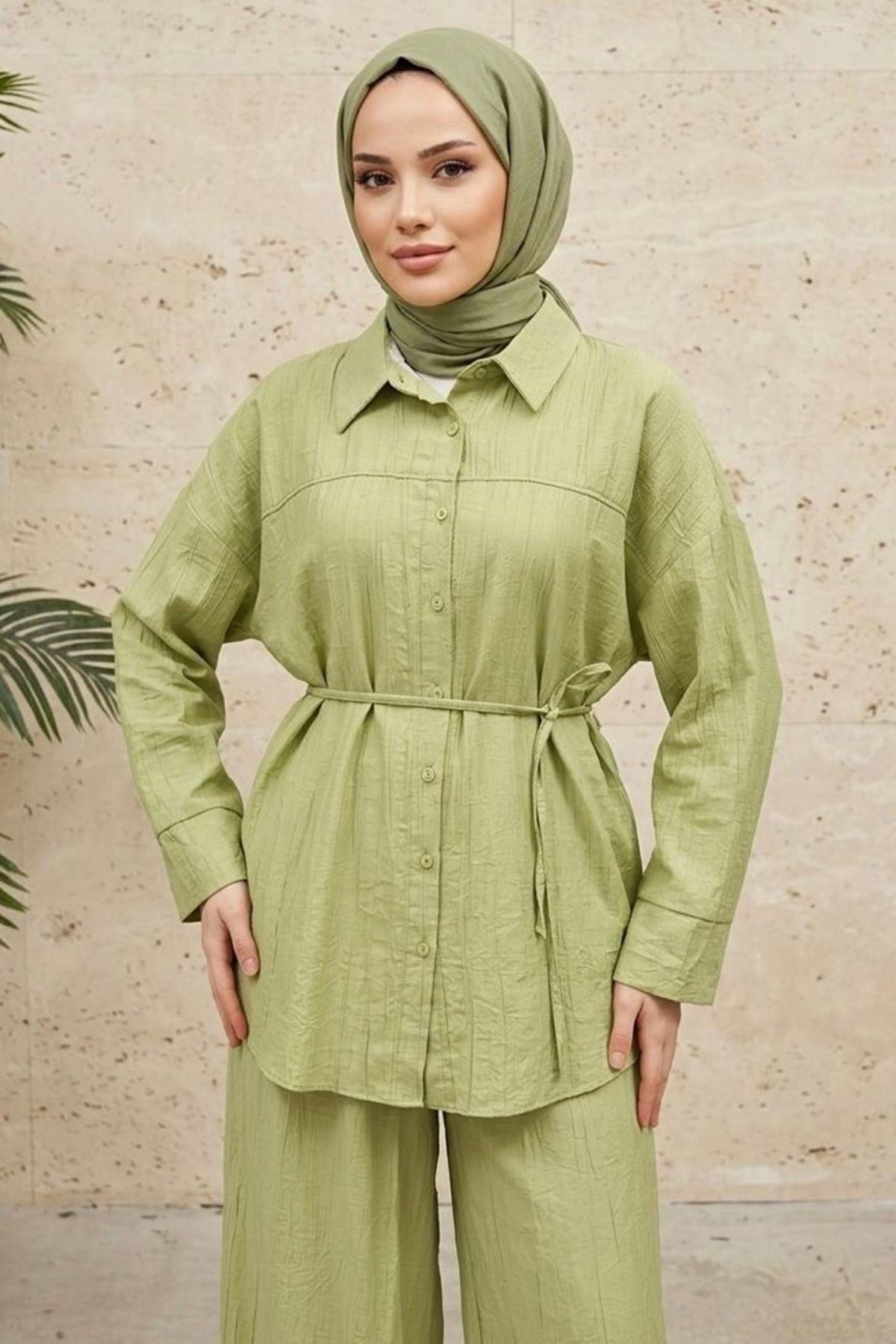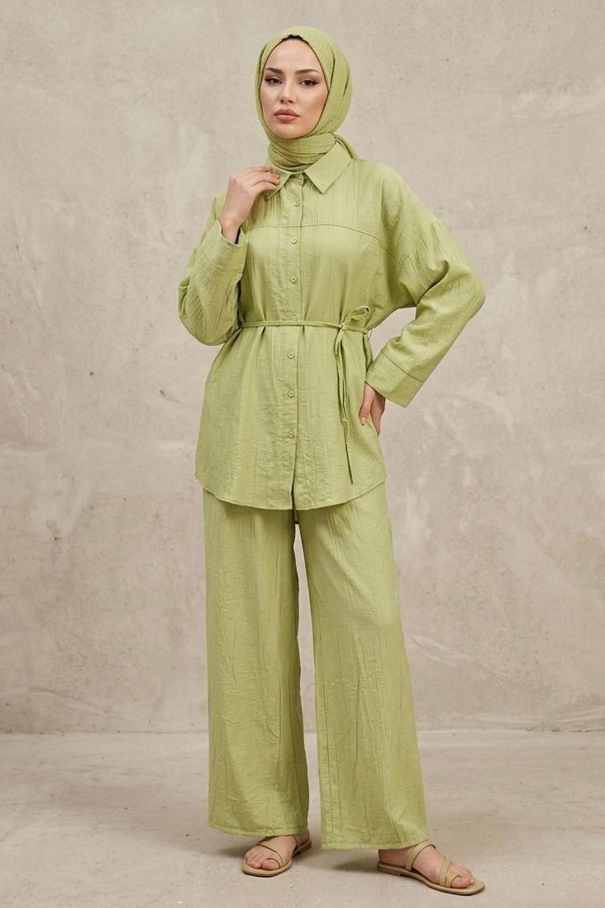 Kadın Yeni Sezon Kuşaklı İkili Tesettür Takım Yağ Yeşili Renk Rahat Kalıp Yazlık Kadın Tesettür Takım