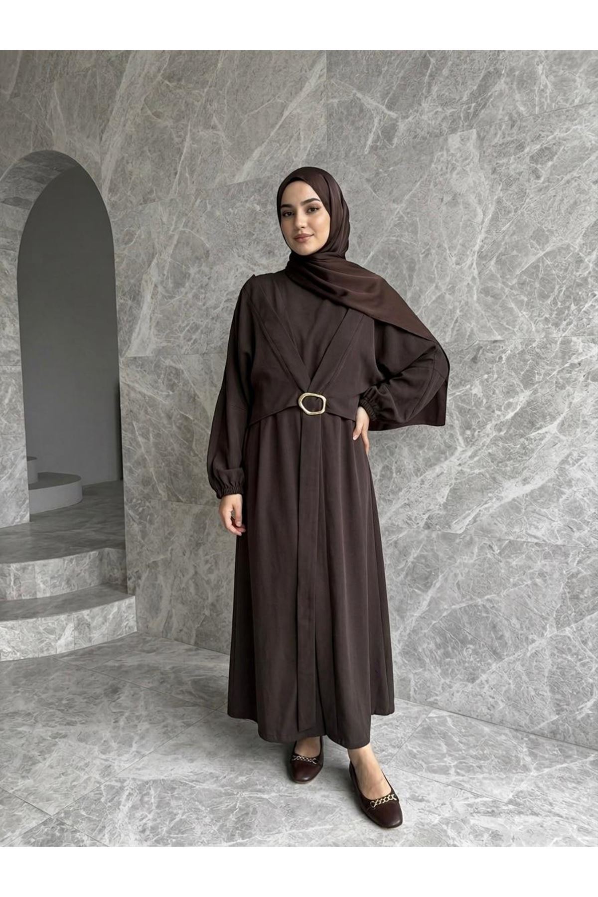 Önden Bağlamalı Aksesuar Detay İkili Elbise-Kahve