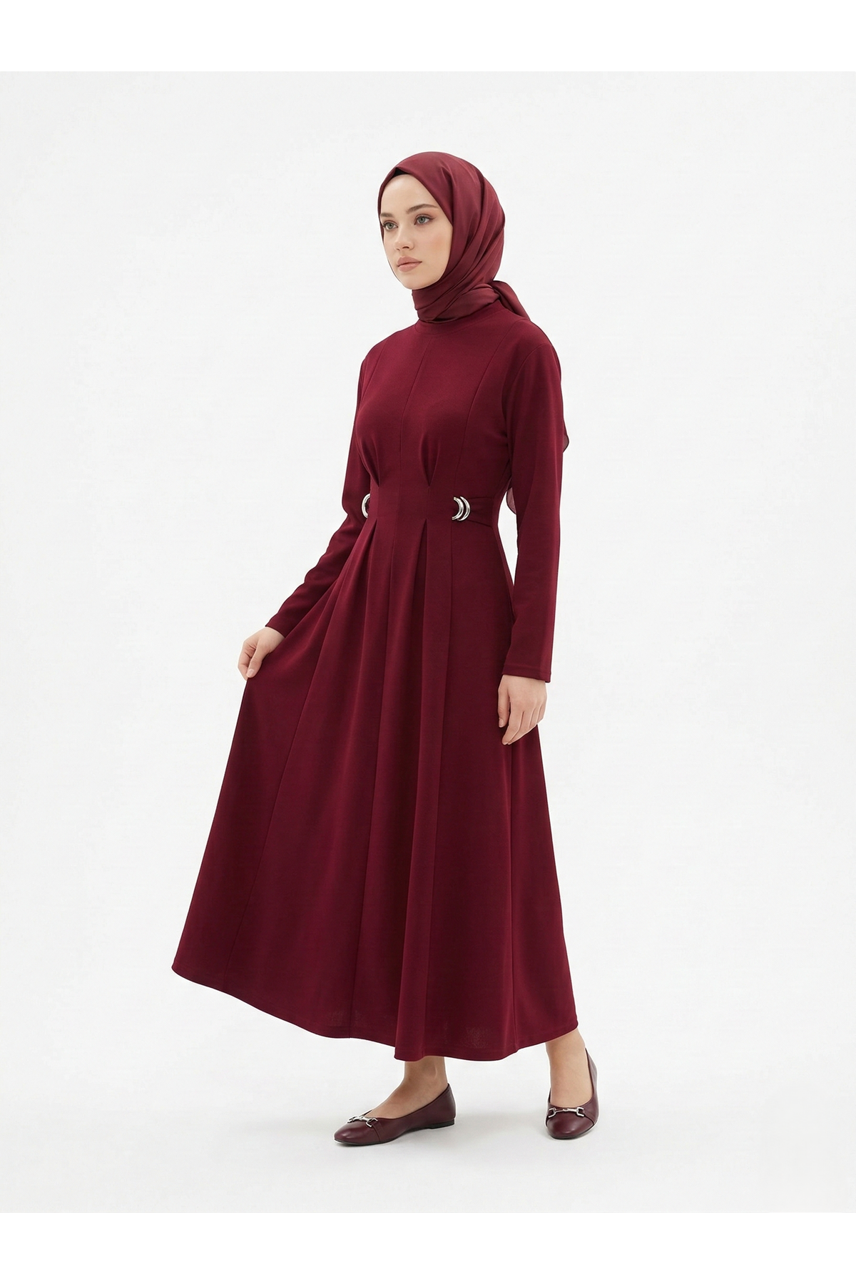 Önü Pensli Kuşak Aksesuar Detay Elbise-Bordo