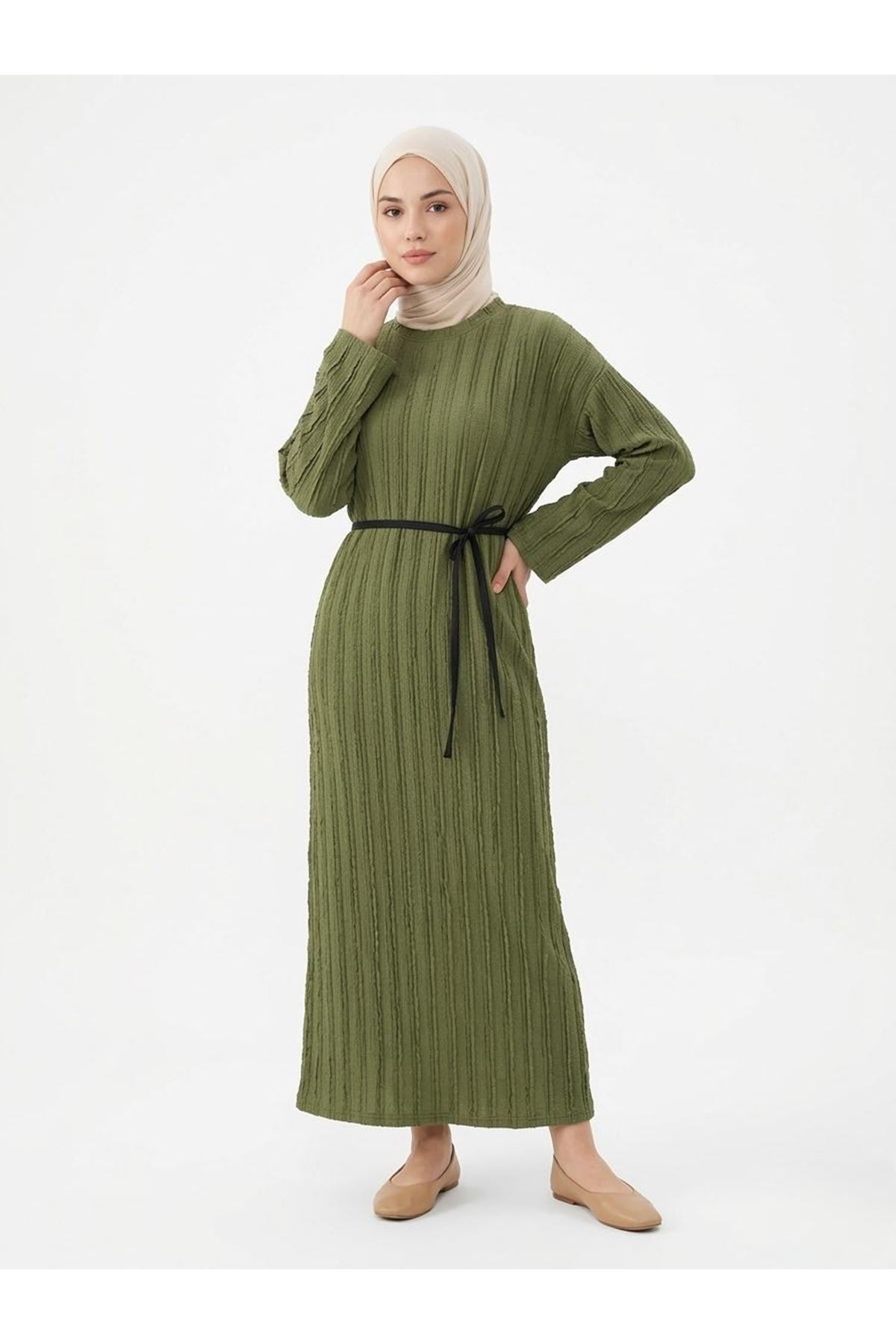 Pilise Dokulu Kemer Detay Elbise-Haki