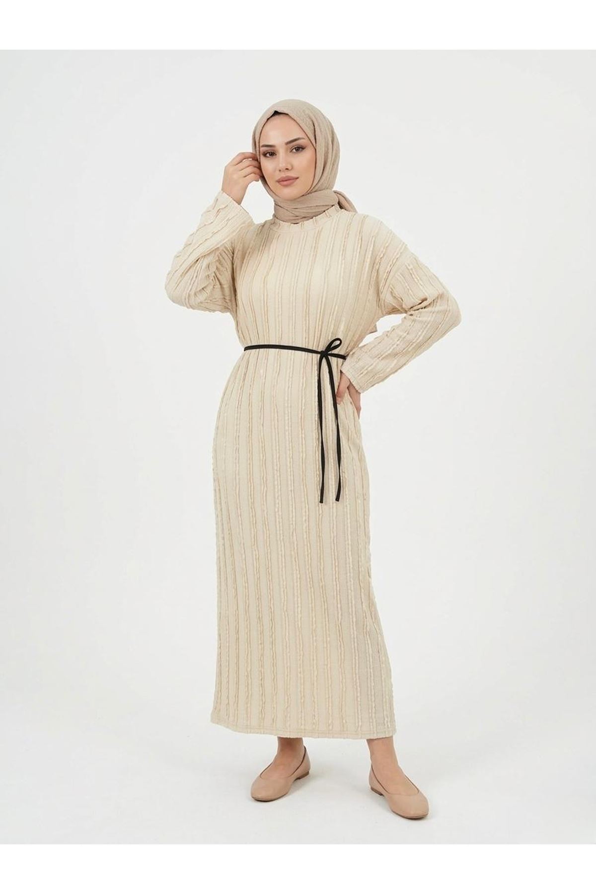 Pilise Dokulu Kemer Detay Elbise-Taş