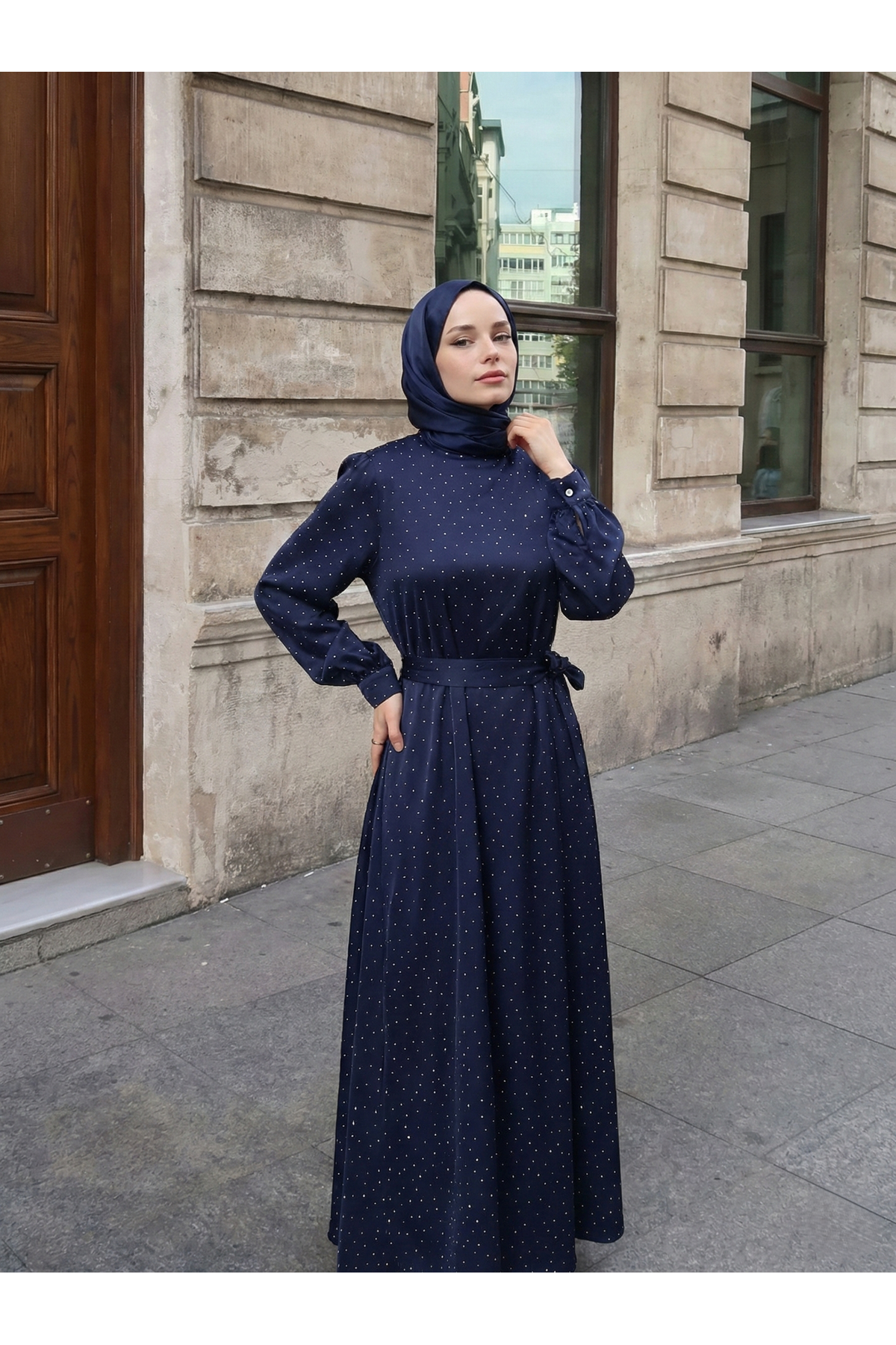 Saten Taşlı Elbise-Lacivert