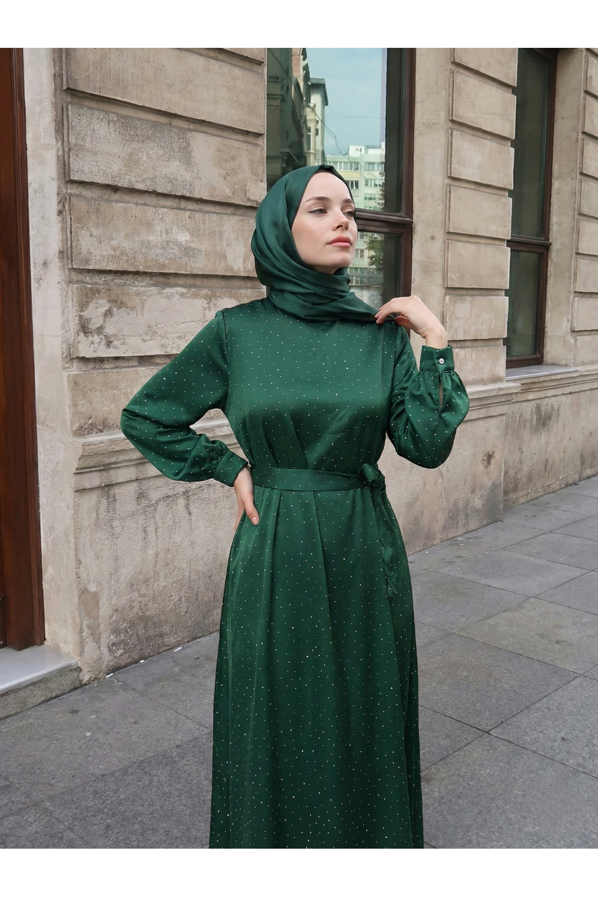 Saten Taşlı Elbise-Zümrüt Yeşili