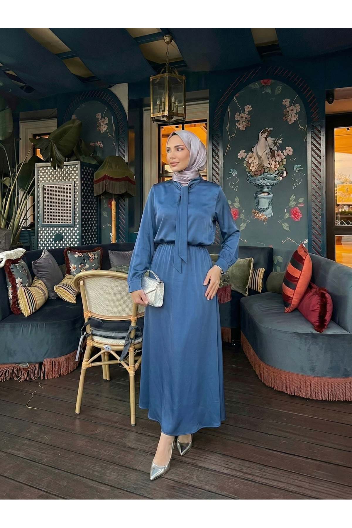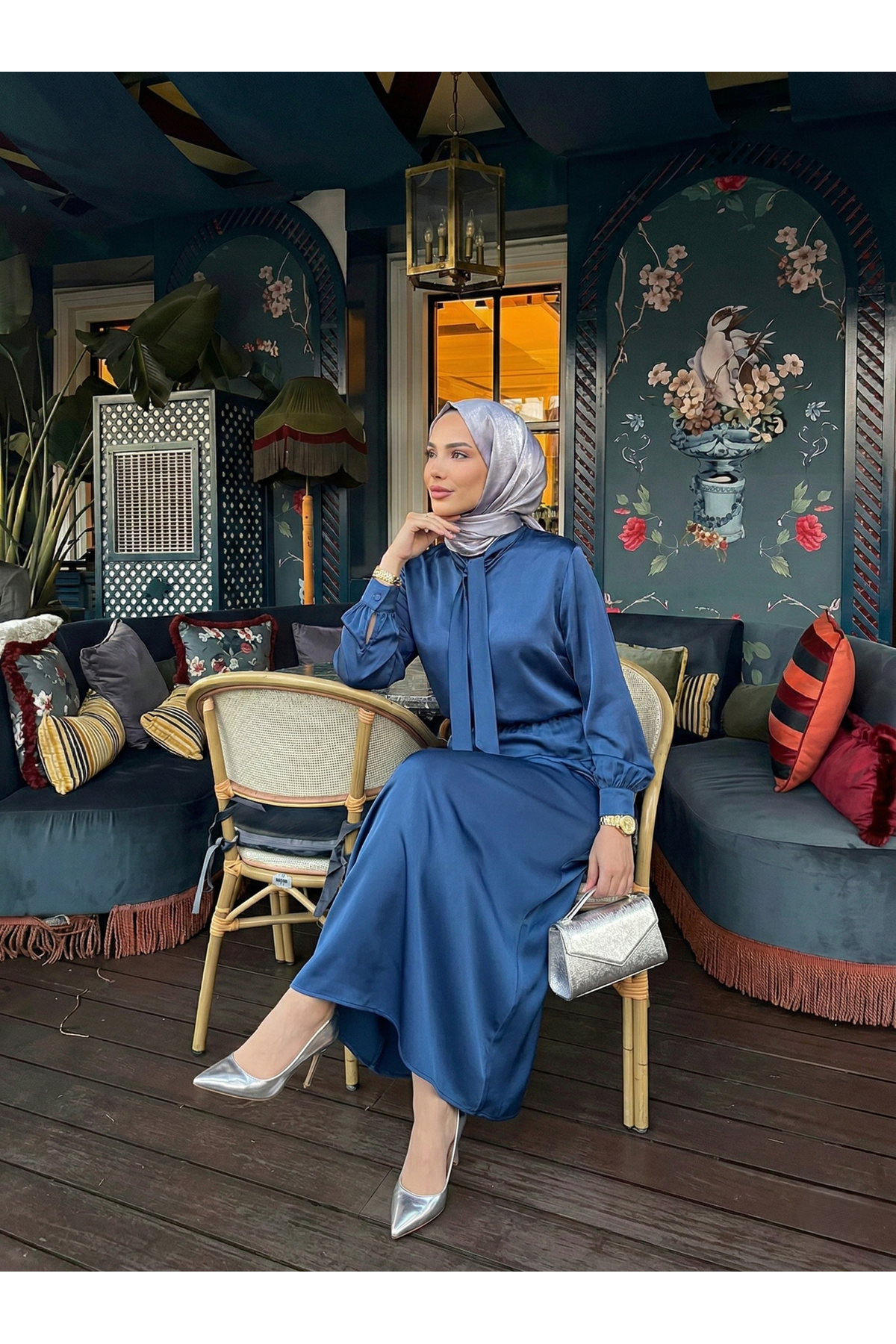 Yaka Bağlamalı Saten Etekli Takım-Petrol Mavisi