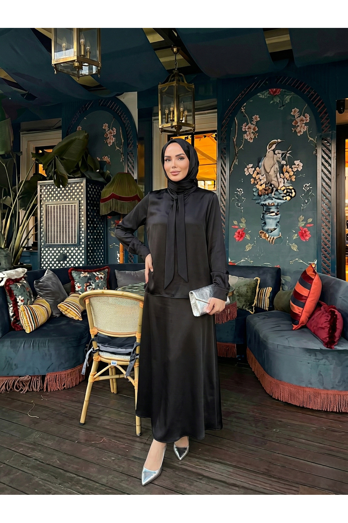 Yaka Bağlamalı Saten Etekli Takım-Siyah