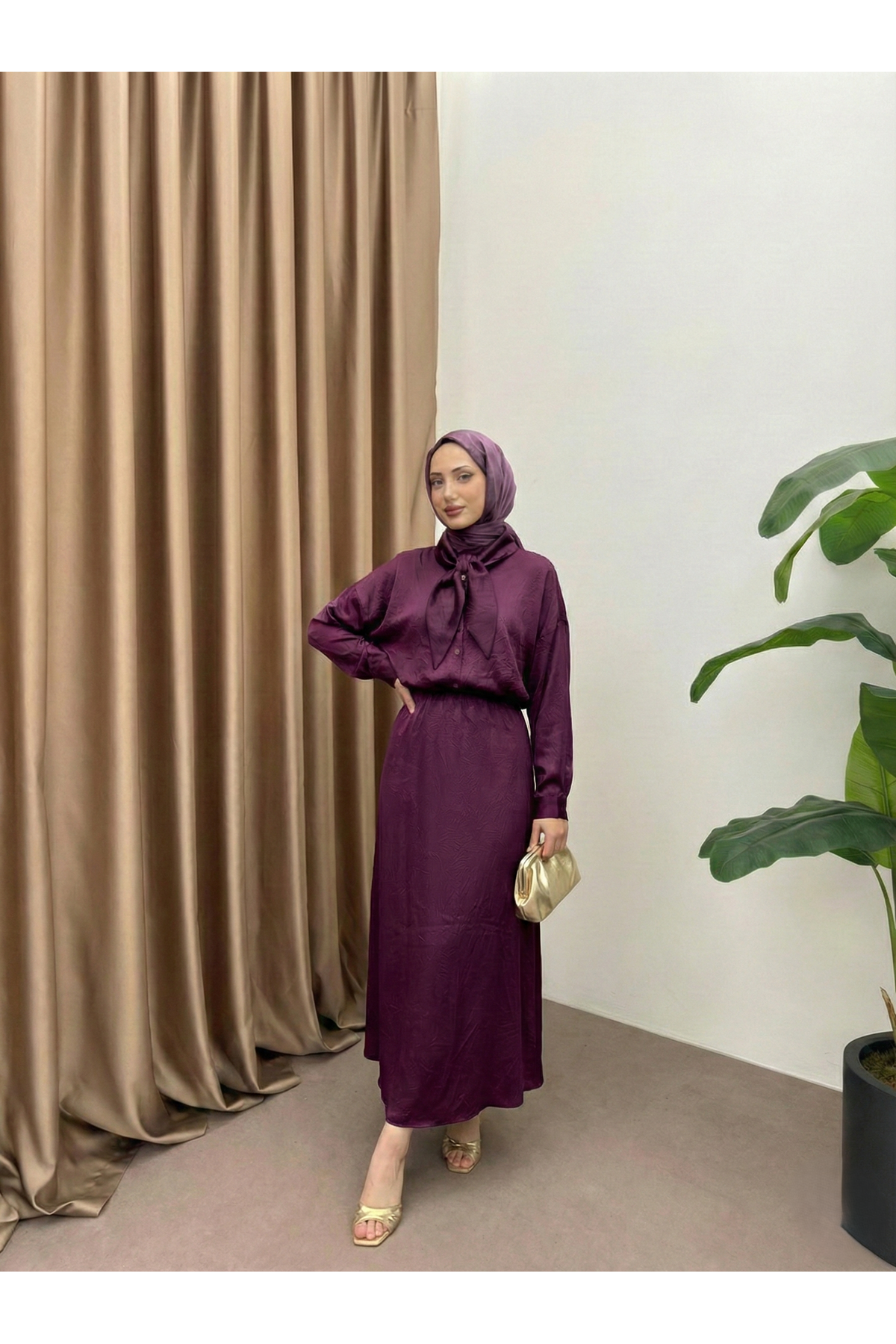 Yaka Detay Etekli Saten Takım-Mürdüm