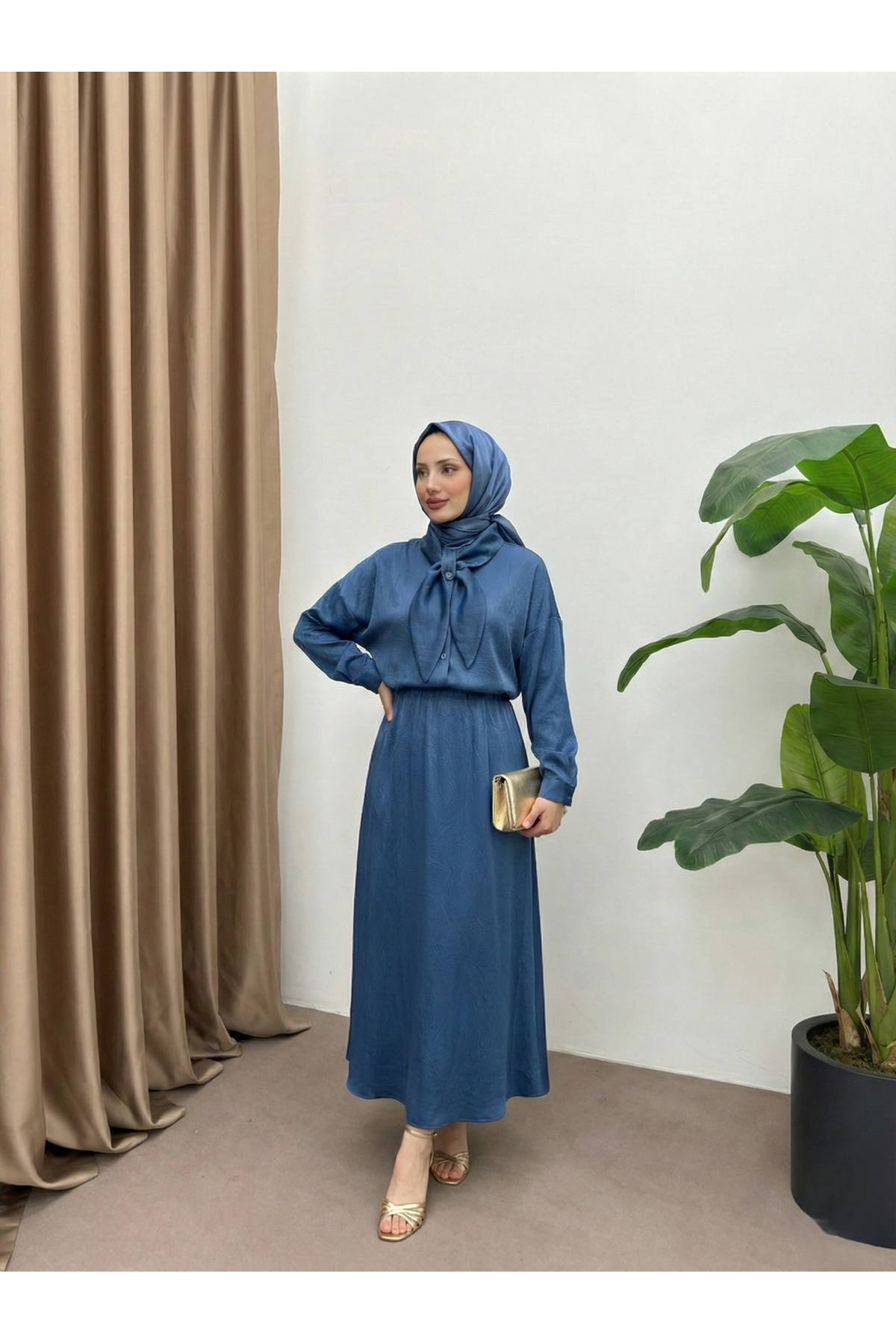 Yaka Detay Etekli Saten Takım-Petrol Mavisi