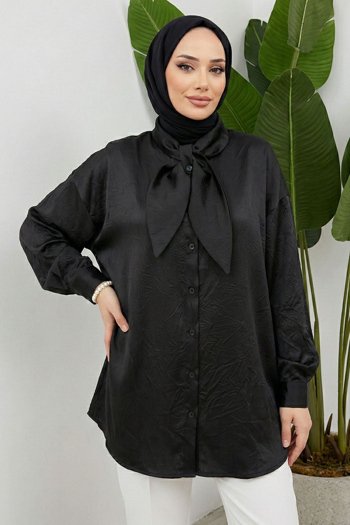 Yaka Detay Saten Tunik-Siyah