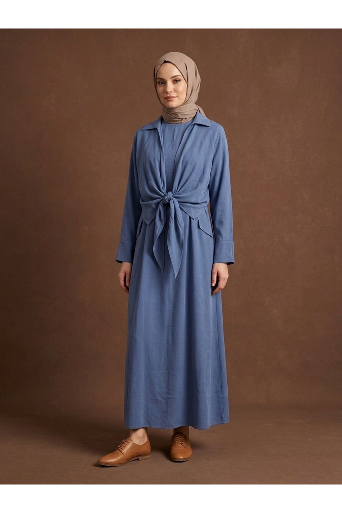 Yakalı Ön Bağlamalı İkili Elbise-İndigo