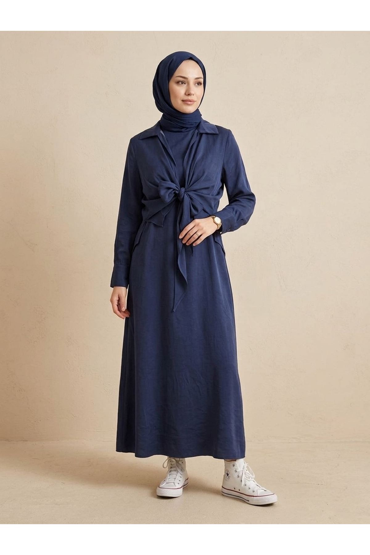 Yakalı Ön Bağlamalı İkili Elbise-Lacivert