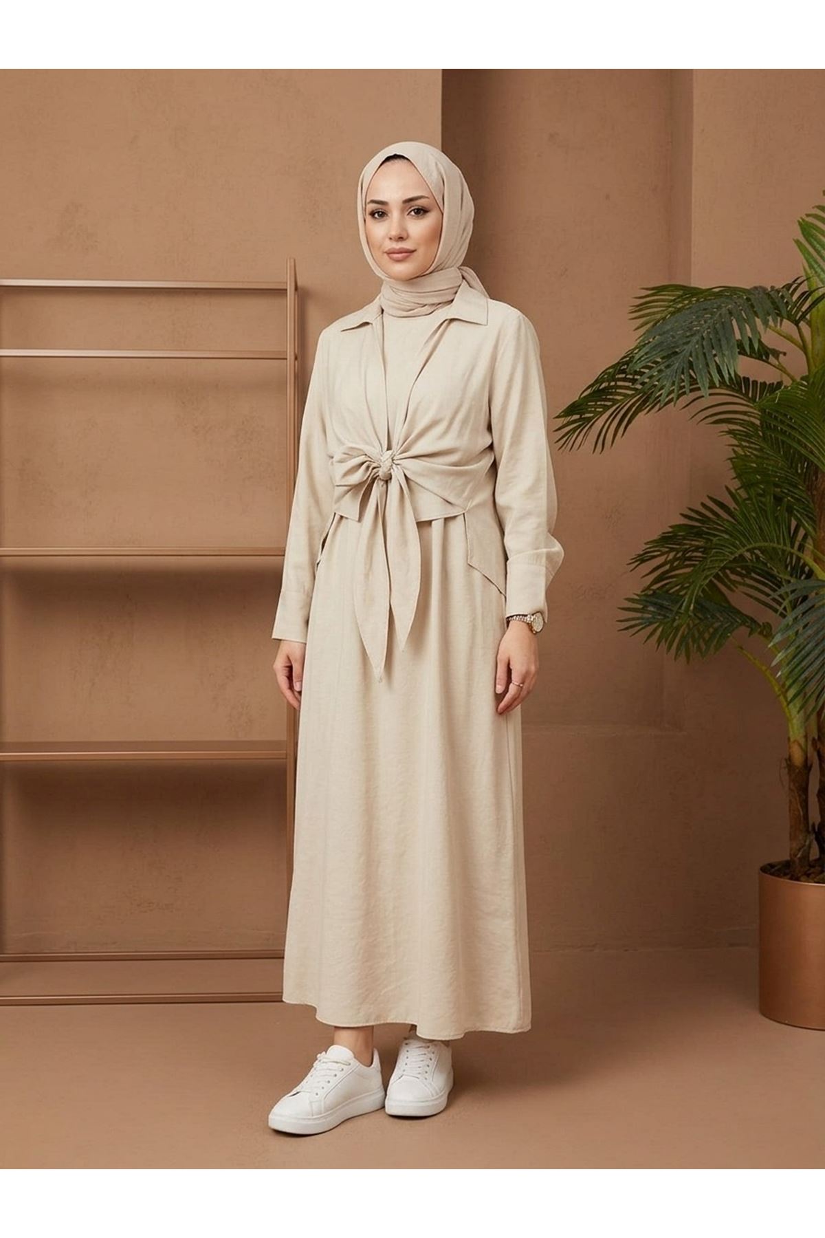 Yakalı Ön Bağlamalı İkili Elbise