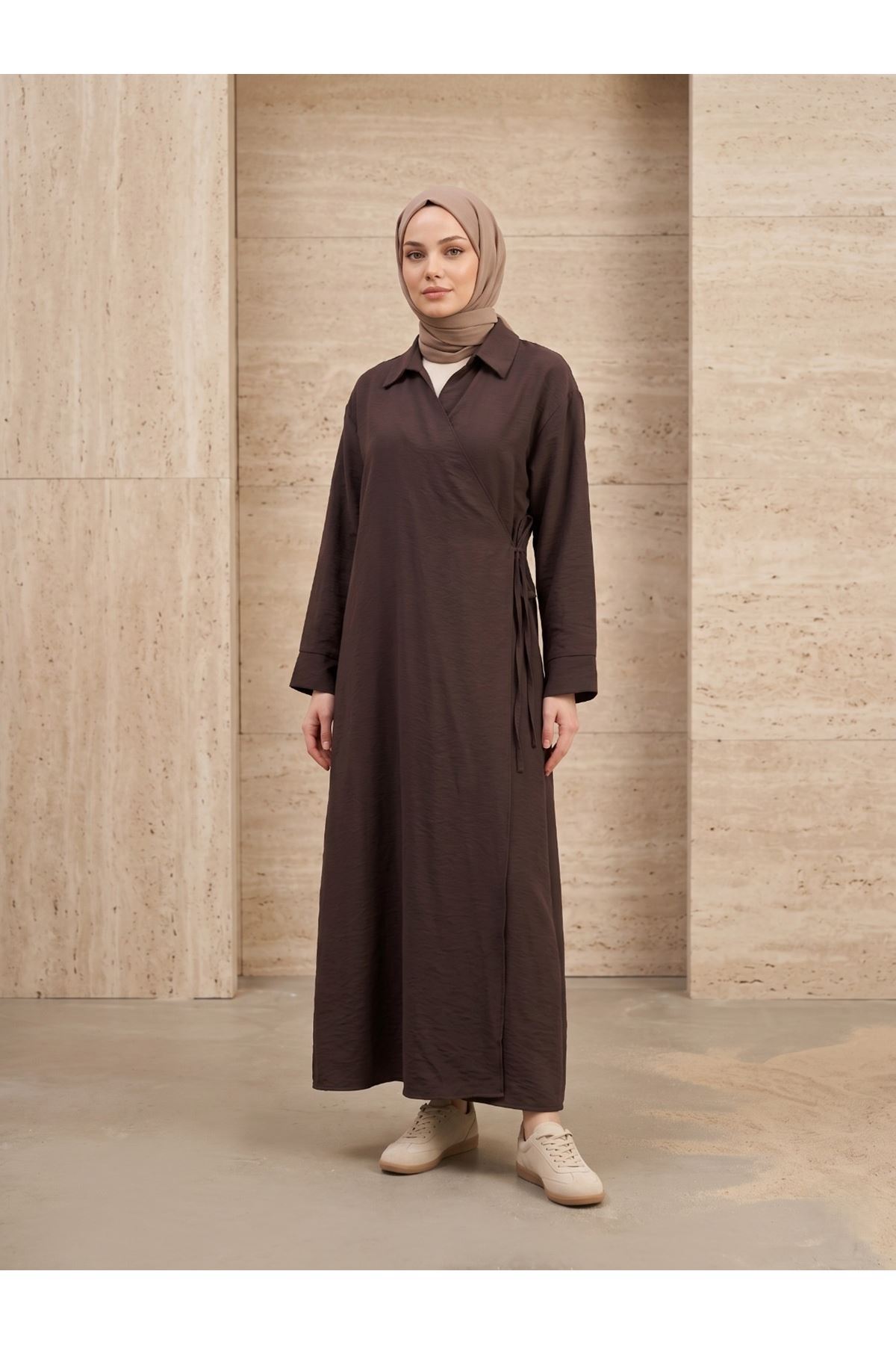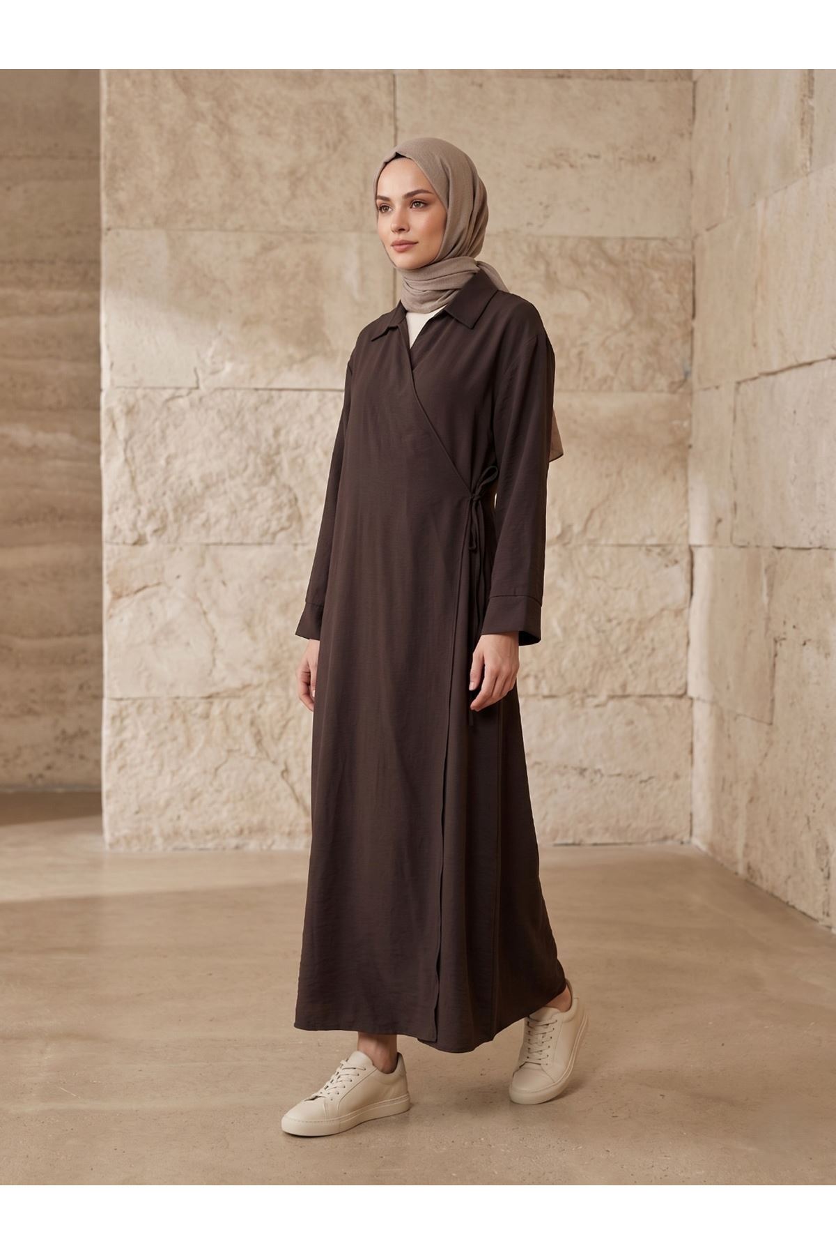 Yakalı Yandan Bağlamalı Uzun Ceket-Kahve